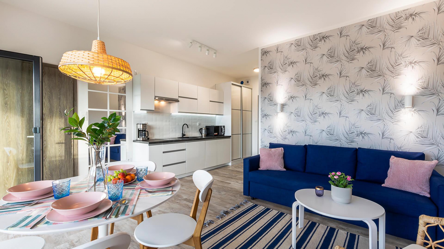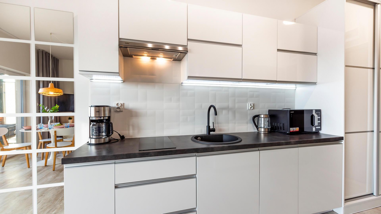 W pełni wyposażonym aneksie kuchennym Goście korzystać mogą z nowoczesnego sprzętu AGD m.in. lodówki, kuchenki, kuchenki mikrofalowej, zmywarki oraz ekspresu do kawy. Do dyspozycji Gości jest także komplet naczyń, sztućce, akcesoria kuchenne, szklanki i kieliszki do wina. Wszystko, co potrzebne by samodzielnie przygotować posiłki i cieszyć się wspólnymi chwilami z bliskimi.