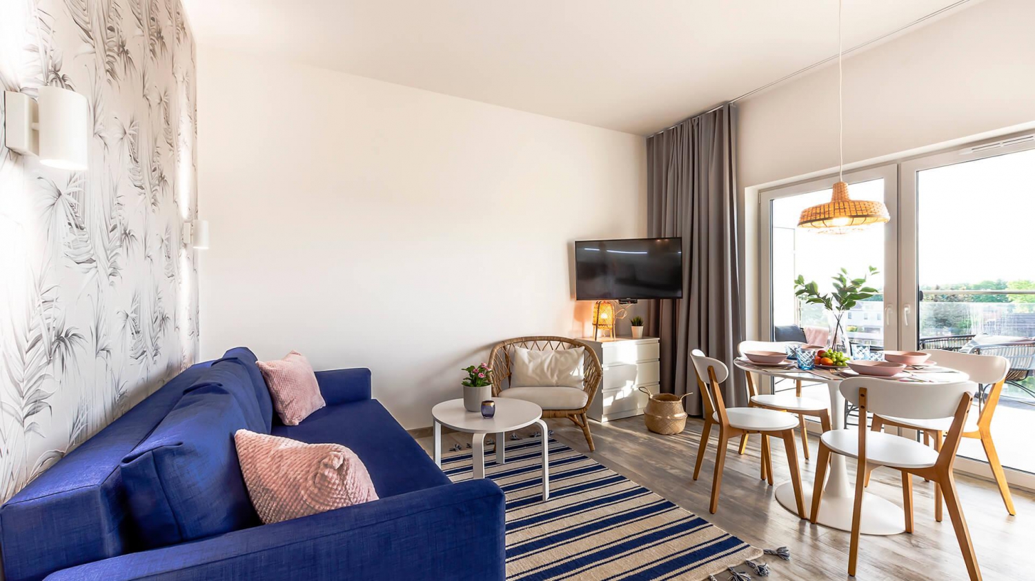VacationClub™ – 5 Mórz Sianożęty Apartament 1G/35 to nowoczesny apartament zlokalizowany na 3 piętrze nowoczesnego osiedla, na terenie którego znajduje się kryty basenem, grota solna, sauna oraz zewnętrzny plac rekreacyjny. Położony jest ok. 500 m od pięknej i kameralnej plaży. Składa się z bogato wyposażonego aneksu kuchennego, łazienki z kabiną prysznicową, wygodnego salonu z rozkładaną 2-osobową sofą oraz sypialni z dużym łóżkiem małżeńskim. Do apartamentu przynależy zewnętrzne miejsce postojowe. W Apartamencie dostępna jest sieć WiFi.