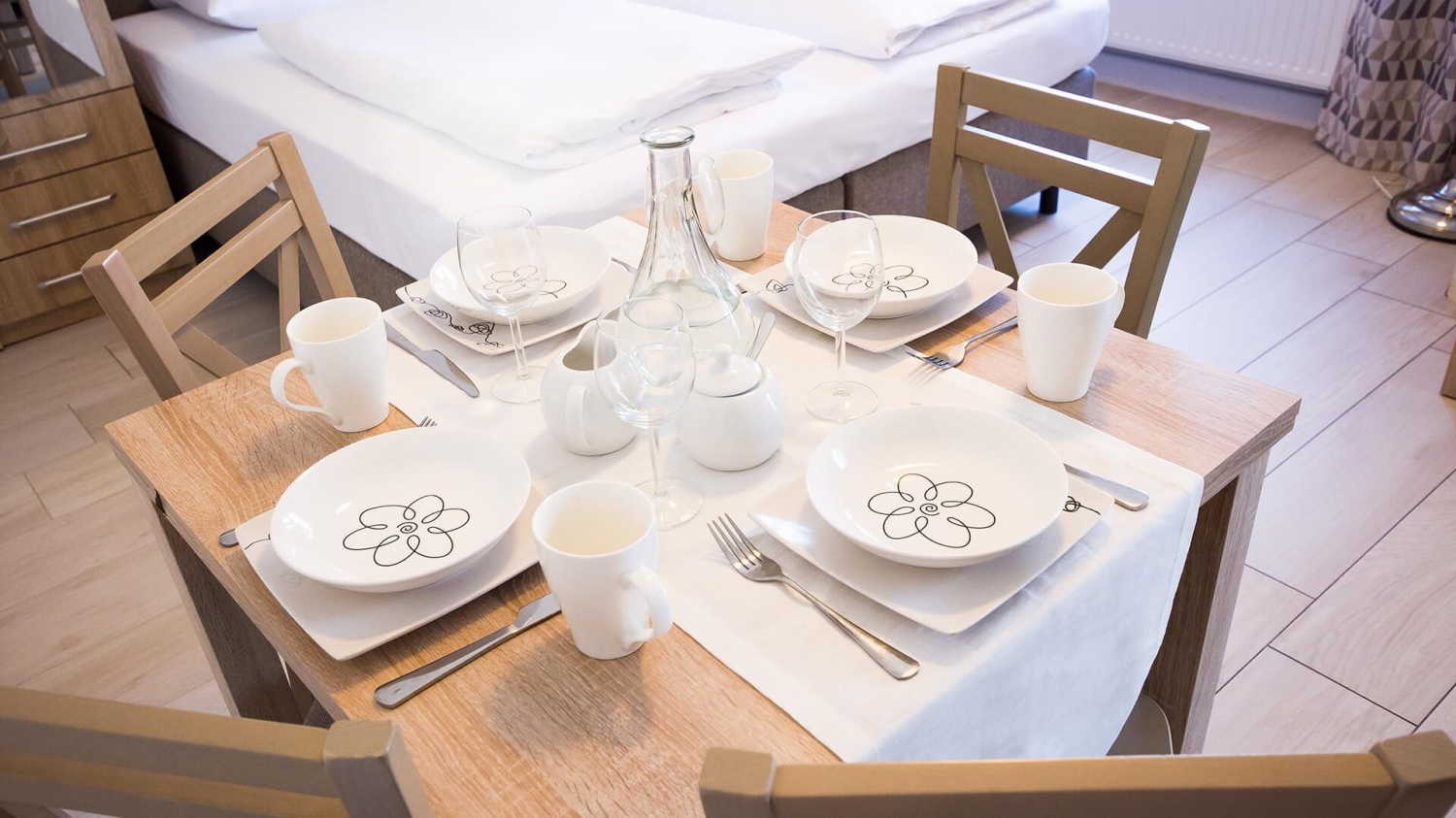 W apartamencie znajduje się w pełni wyposażony aneks kuchenny przystosowany do codziennych potrzeb Naszych Gości. Do dyspozycji oddajemy sprzęt AGD: lodówkę, płytę grzewczą, ekspres do kawy i opiekacz oraz komplet naczyń, sztućce, szklanki, filiżanki, kieliszki do wina oraz wszystkie inne akcesoria kuchenne niezbędne do samodzielnego przygotowania posiłków.