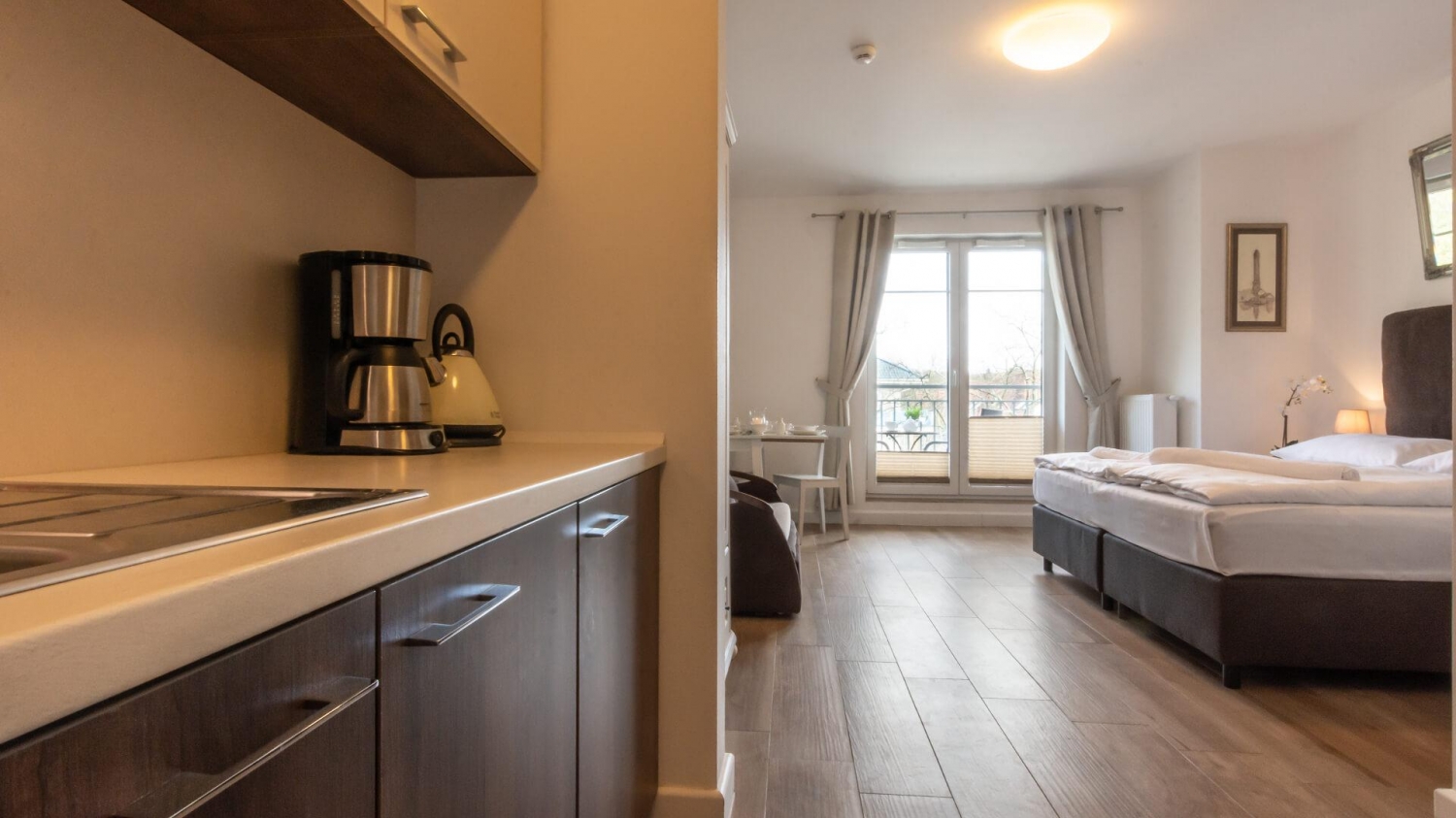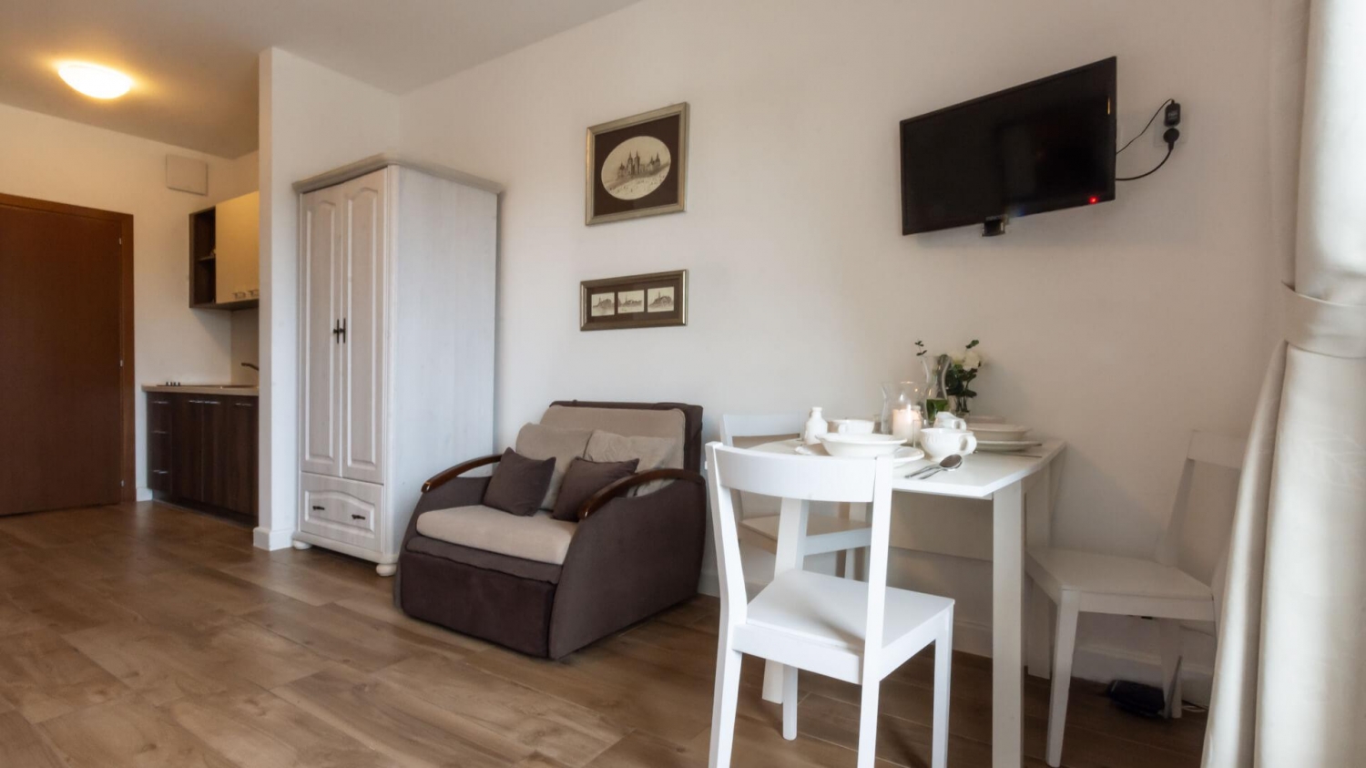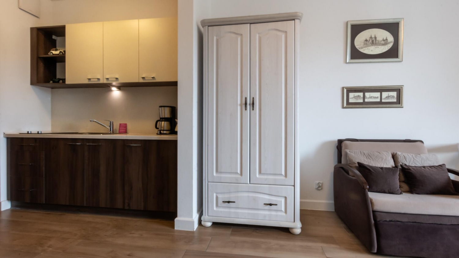 W apartamencie znajduje się w pełni wyposażony aneks kuchenny przystosowany do codziennych potrzeb naszych Gości. Do dyspozycji oddajemy sprzęt AGD: lodówkę, płytę grzewczą, ekspres do kawy i opiekacz, a także komplet naczyń, sztućce, szklanki, filiżanki, kieliszki do wina oraz wszystkie inne akcesoria kuchenne niezbędne do samodzielnego przygotowania posiłków.