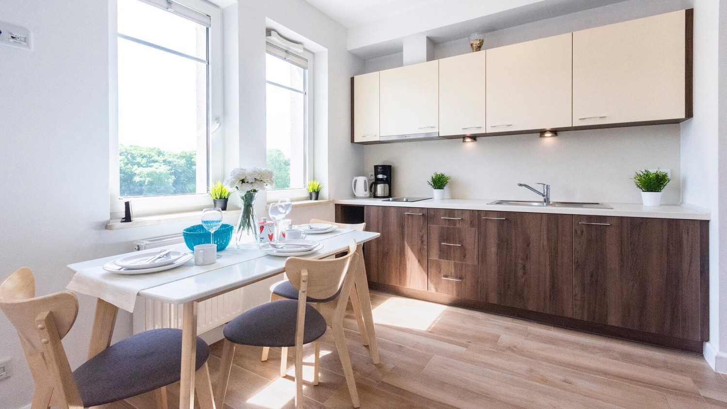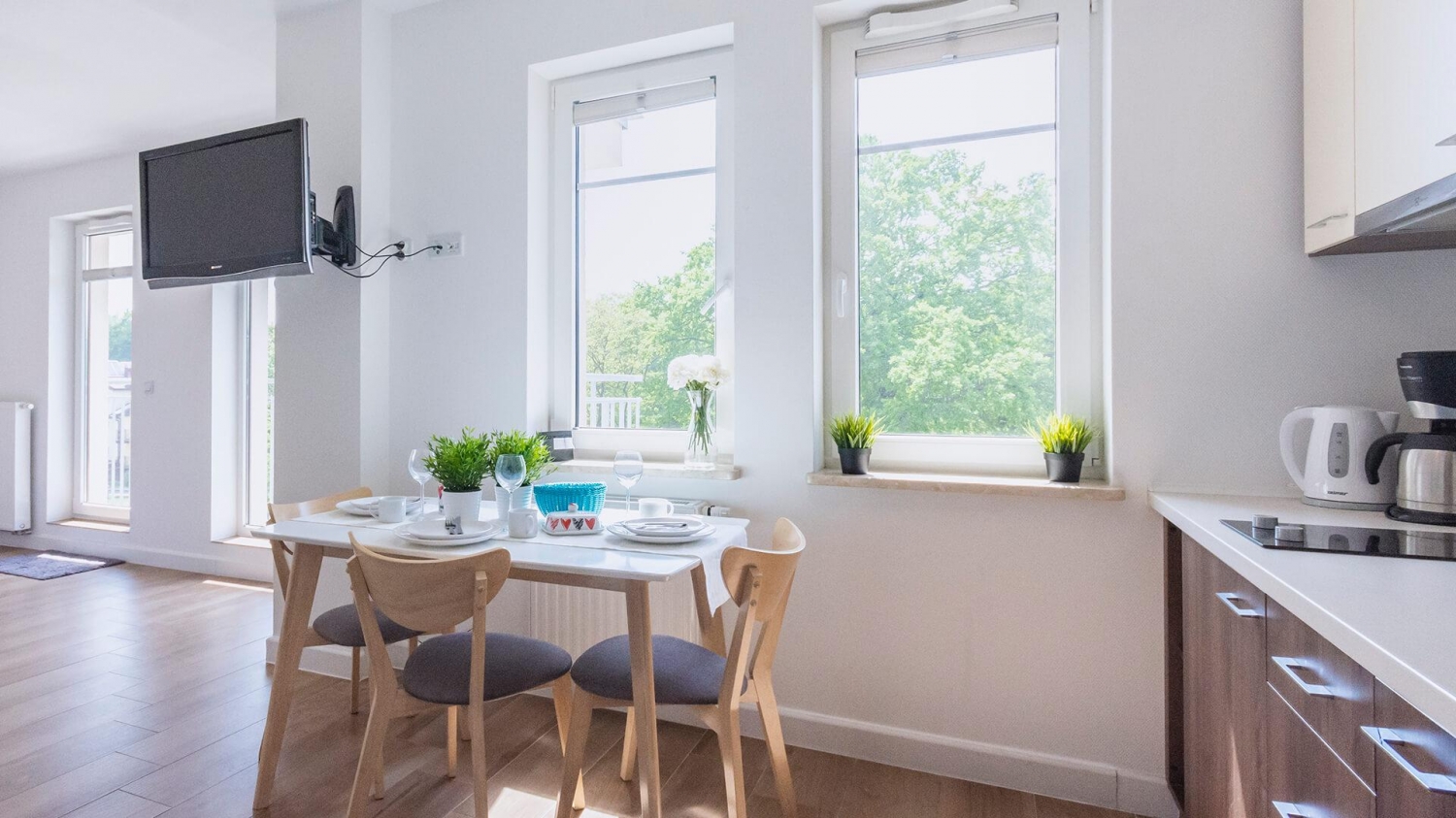 W apartamencie znajduje się bogato wyposażony aneks kuchenny, przystosowany do zaspokajania codziennych potrzeb. Do dyspozycji naszych Gości udostępniamy nowoczesny sprzęt AGD m.in. lodówkę, kuchenkę, a także komplet naczyń, sztućce, akcesoria kuchenne, szklanki i kieliszki do wina - wszystko, co potrzebne, by samodzielnie przygotować posiłki i cieszyć się wspólnymi chwilami z bliskimi.