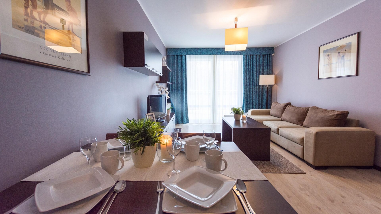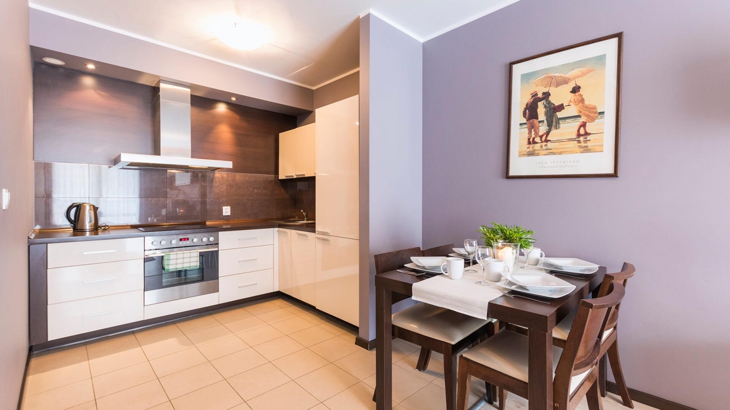 W apartamencie znajduje się bogato wyposażony aneks kuchenny przystosowany do zaspokajania codziennych potrzeb. Do dyspozycji naszych Gości udostępniamy nowoczesny sprzęt AGD m.in. lodówkę, kuchenkę z piekarnikiem, zmywarkę oraz komplet naczyń, sztućce, akcesoria kuchenne, szklanki i kieliszki do wina. Wszystko, co potrzebne by samodzielnie przygotować posiłki i cieszyć się wspólnymi chwilami z bliskimi.