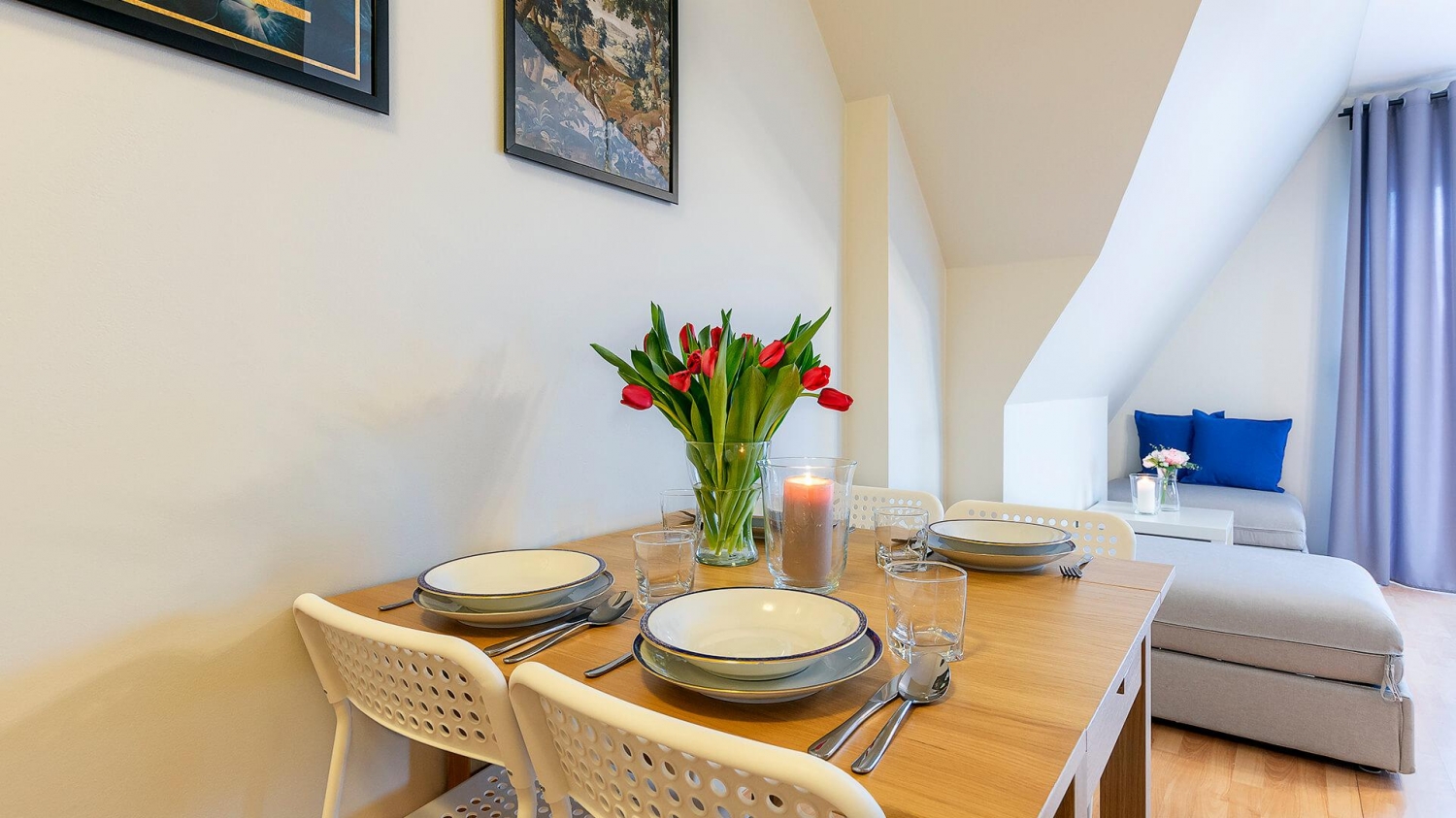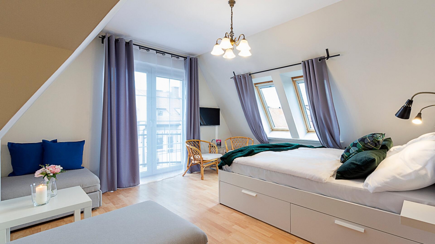 Apartament położony jest w odległości 100 metrów od Nowej Starówki i 10 metrów od Starej Starówki. W pobliżu znajdują się 2 galerie handlowe a uliczki przepełnione są sklepami i kawiarniami. W odległości 50 metrów znajduje się duży miejski plac zabaw dla dzieci oraz kino. Bliska odległość od dworca sprawi że dla podróżujących PKP będzie to idealne miejsce na wypoczynek. Do plaży można dojść spacerem w 15 minut. Dla osób ceniących sobie ciszę mamy 2 parki z licznymi miejscami do siedzenia a nawet gry w szachy. Dodatkowo Goście mogą skorzystać z uroków Radisson Resort Kołobrzeg★★★★ - korzystać z tamtejszej strefy SPA na specjalnych warunkach (m.in. basenów, strefy saun) czy też wykupić w VacationClub™ opcje wyżywienia w hotelowej Restauracji Salmo lub voucher na zabiegi w H2O SPA.