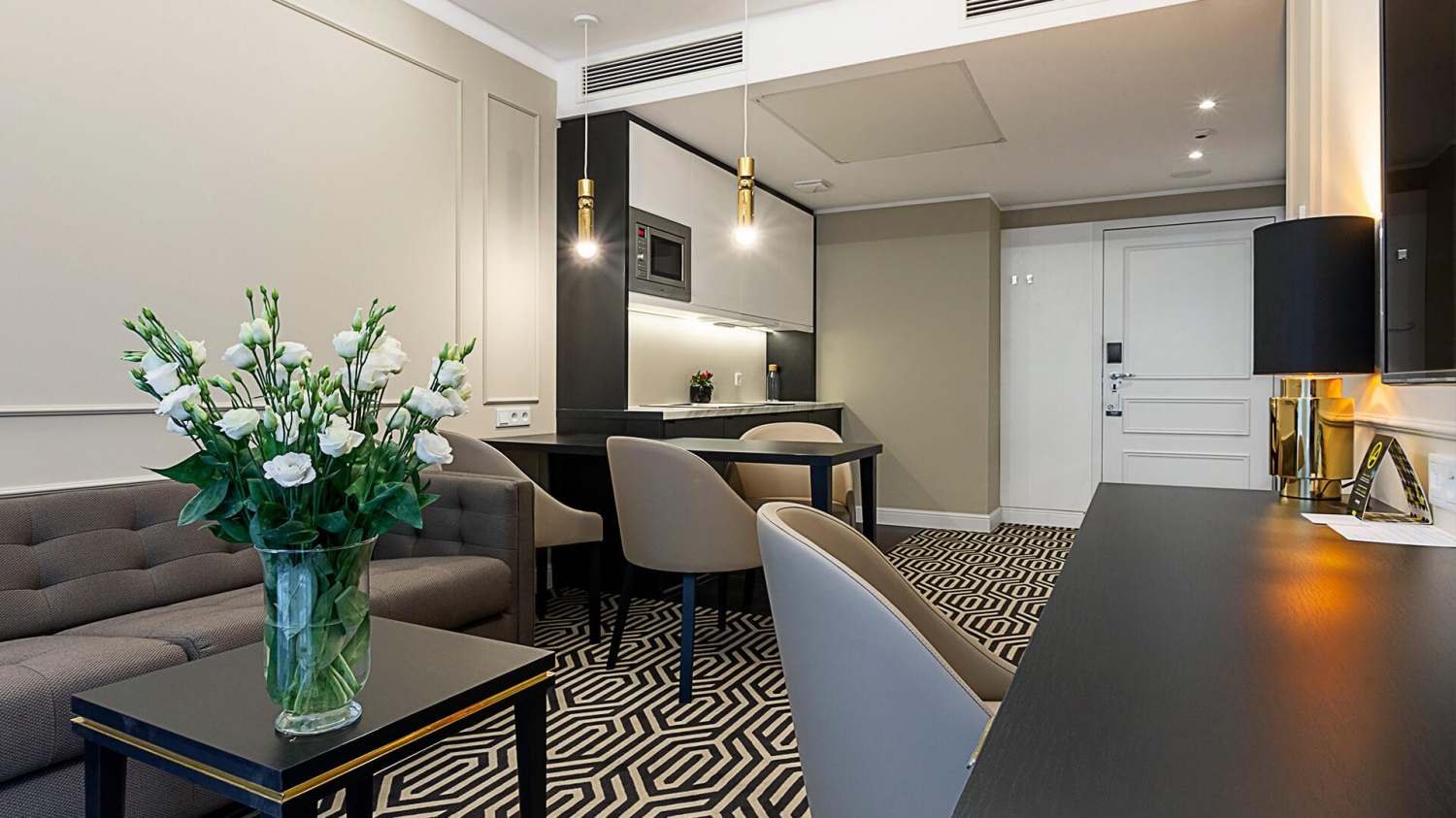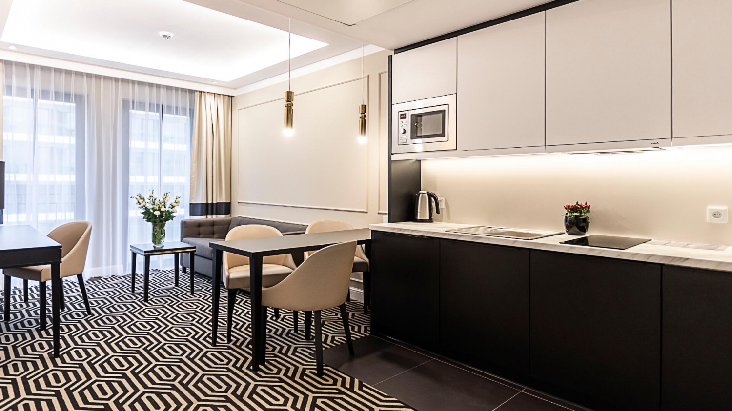 W apartamencie znajduje się w pełni wyposażony nowoczesny i elegancki aneks kuchenny idealny do wspólnego przygotowywania posiłków z bliskimi. Do dyspozycji Gości jest lodówka, zmywarka, płyta grzewcza, kuchenka mikrofalowa, ekspres do kawy oraz komplet naczyń wraz z zestawem narzędzi kuchennych potrzebnych do wspólnego biesiadowania również na słonecznym tarasie z widokiem na morze.