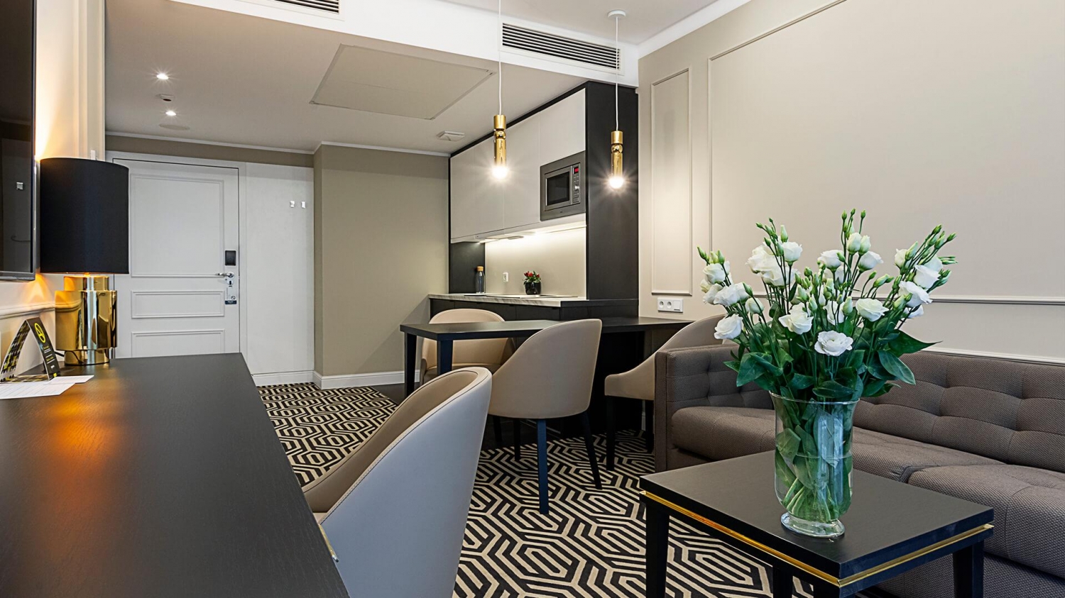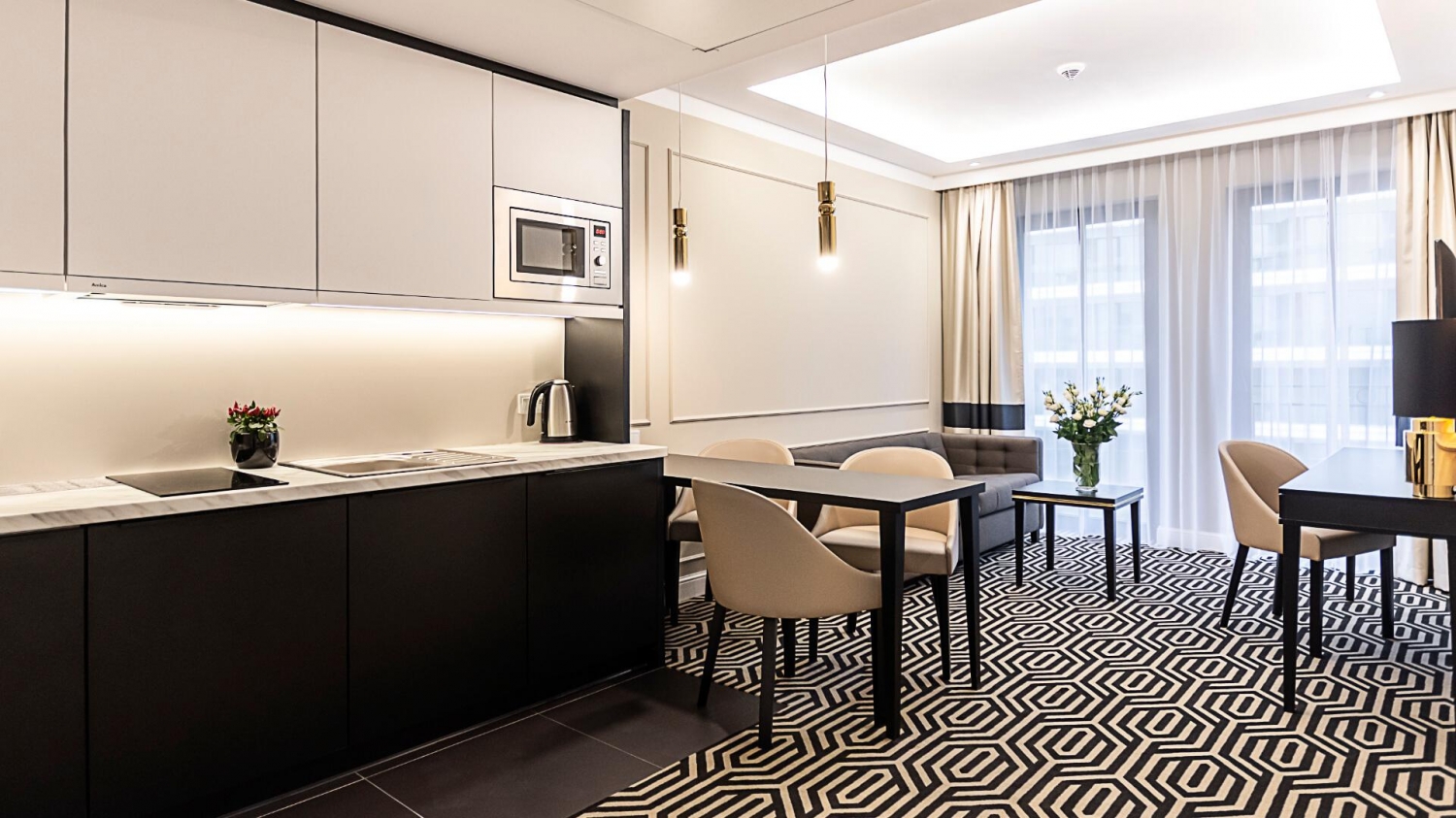W apartamencie znajduje się w pełni wyposażony nowoczesny i elegancki aneks kuchenny idealny do wspólnego przygotowywania posiłków z bliskimi. Do dyspozycji Gości jest lodówka, zmywarka, płyta grzewcza, kuchenka mikrofalowa, ekspres do kawy oraz komplet naczyń wraz z zestawem narzędzi kuchennych potrzebnych do wspólnego biesiadowania również na słonecznym tarasie z widokiem na morze.