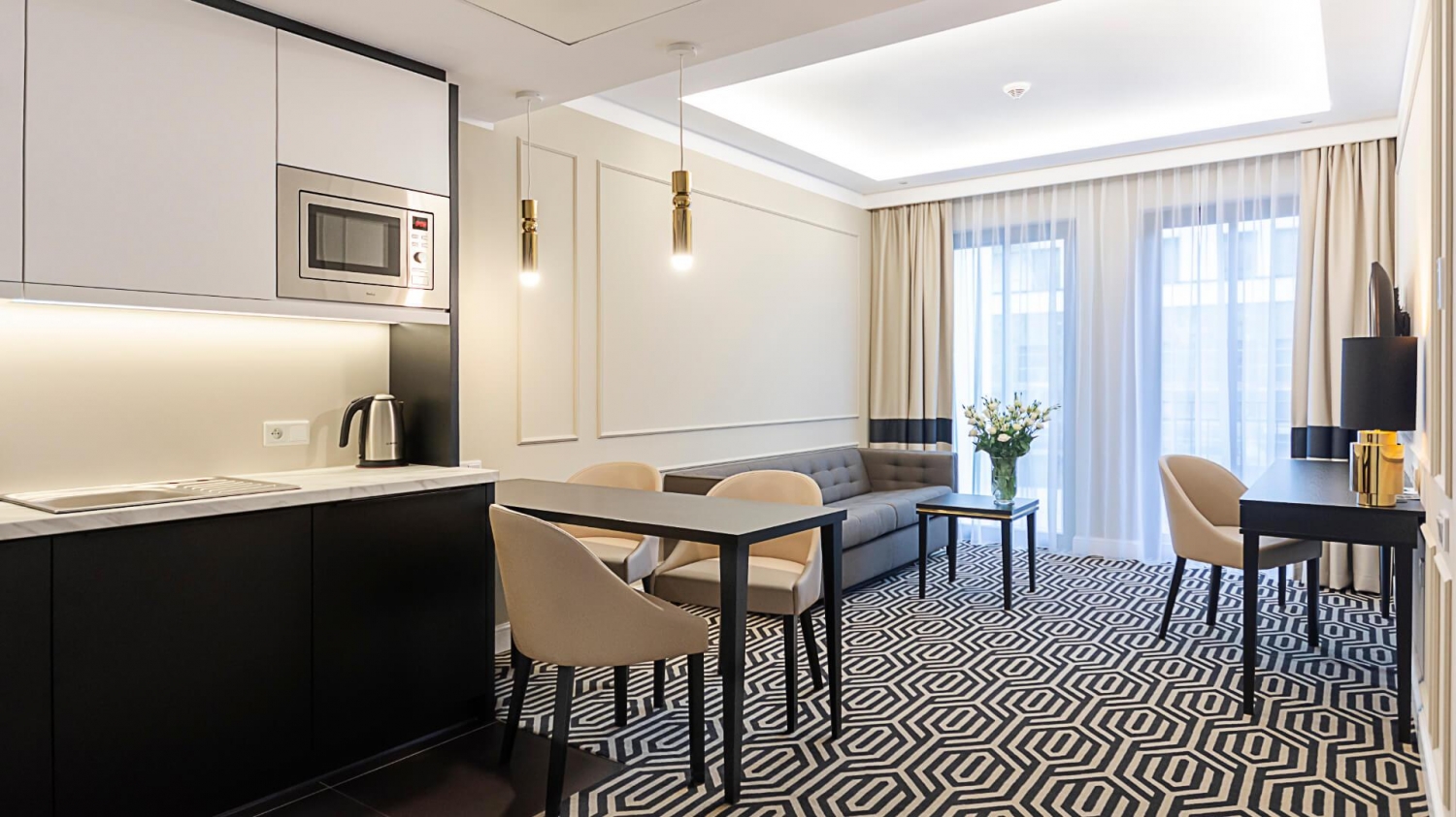 W apartamencie znajduje się w pełni wyposażony, nowoczesny i elegancki aneks kuchenny, idealny do wspólnego przygotowywania posiłków. Do dyspozycji Gości jest lodówka, zmywarka, płyta grzewcza, kuchenka mikrofalowa, ekspres do kawy oraz komplet naczyń wraz z zestawem narzędzi kuchennych.