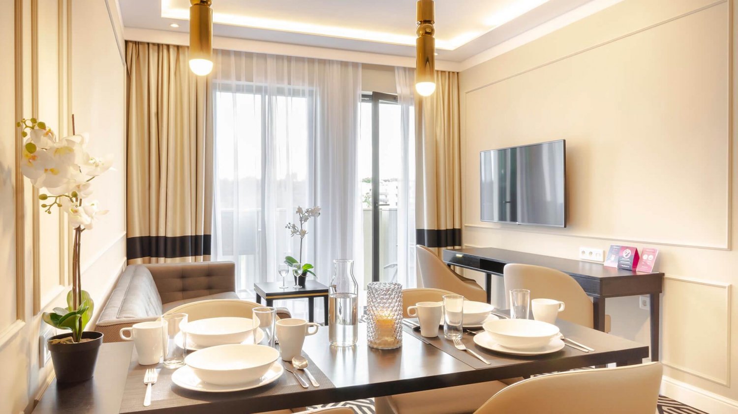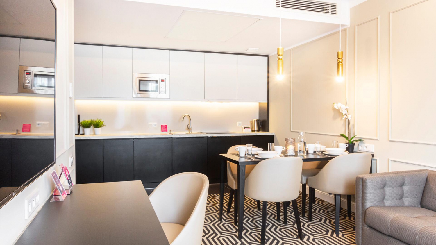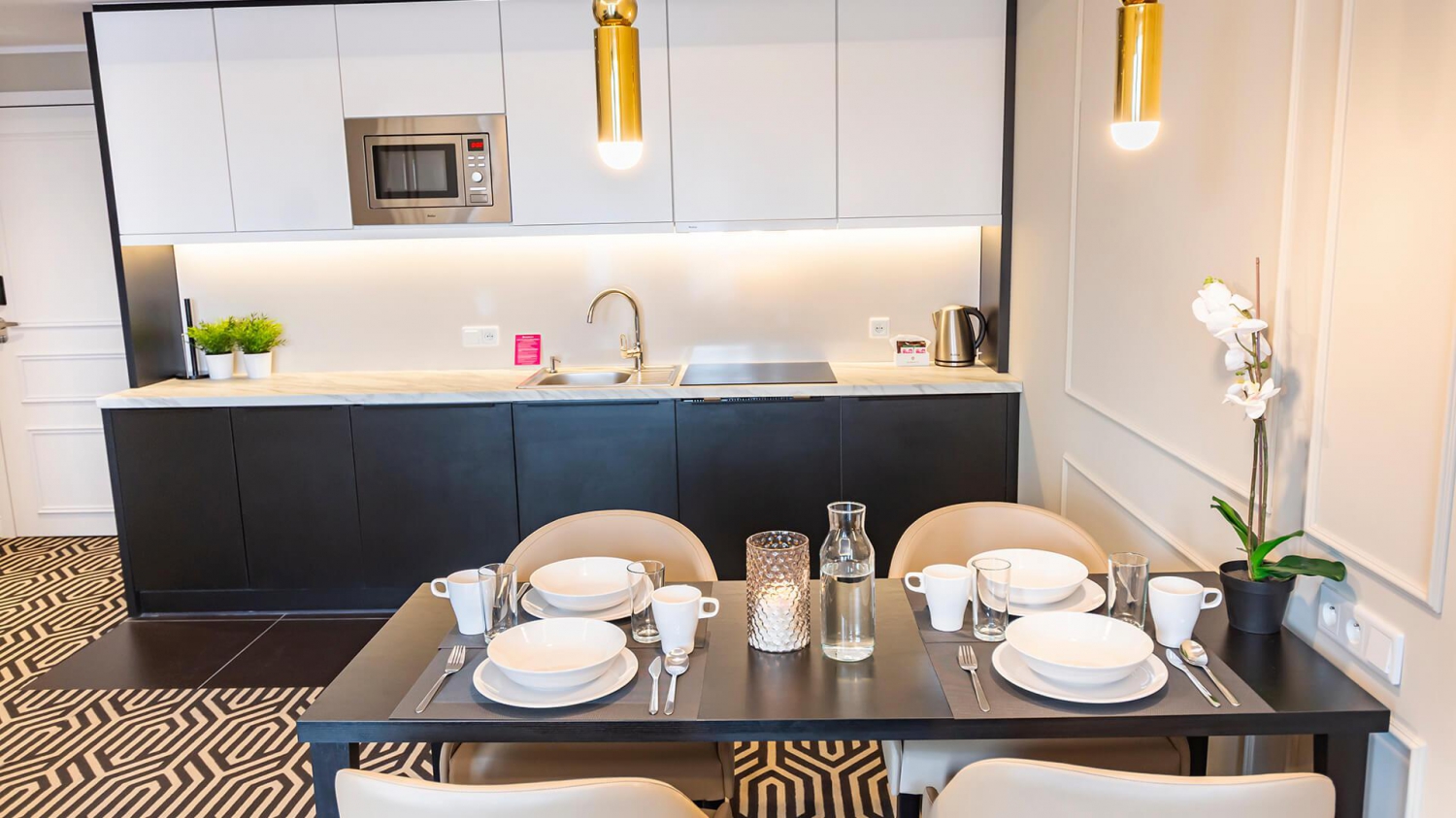 W apartamencie znajduje się w pełni wyposażony, nowoczesny i elegancki aneks kuchenny, idealny do wspólnego przygotowywania posiłków. Do dyspozycji Gości jest lodówka, zmywarka, płyta grzewcza, kuchenka mikrofalowa, ekspres do kawy, toster oraz komplet naczyń wraz z zestawem narzędzi kuchennych.