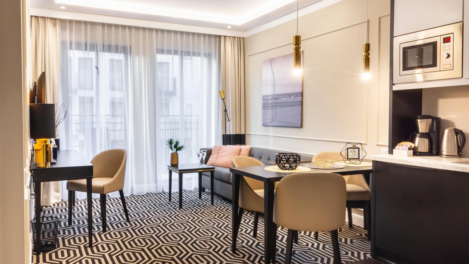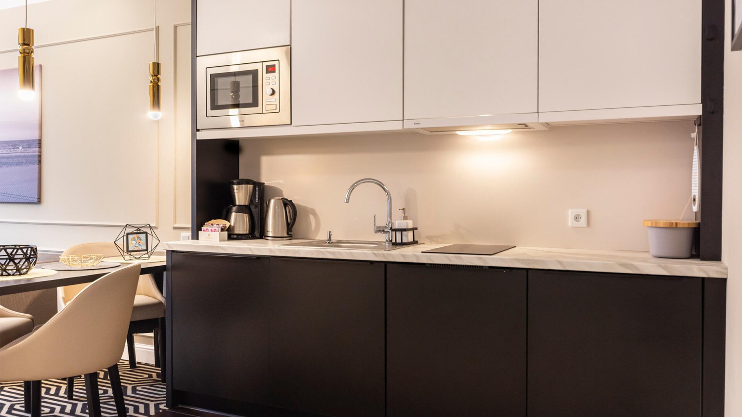 W apartamencie znajduje się w pełni wyposażony nowoczesny i elegancki aneks kuchenny idealny do wspólnego przygotowywania posiłków z bliskimi. Do dyspozycji Gości jest lodówka, zmywarka, płyta grzewcza, kuchenka mikrofalowa, ekspres do kawy oraz komplet naczyń wraz z zestawem narzędzi kuchennych potrzebnych do wspólnego biesiadowania również na słonecznym balkonie z widokiem na morze.