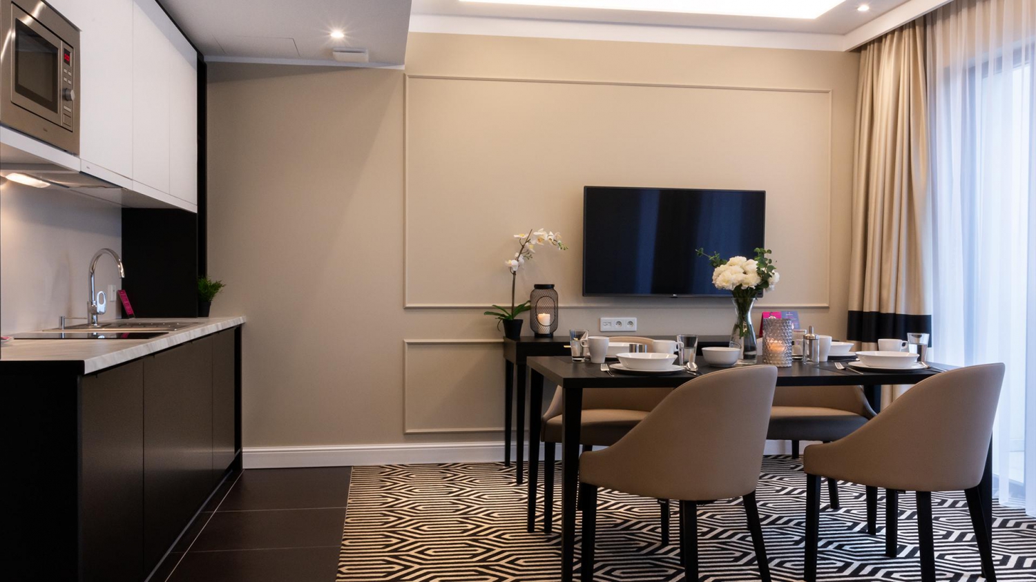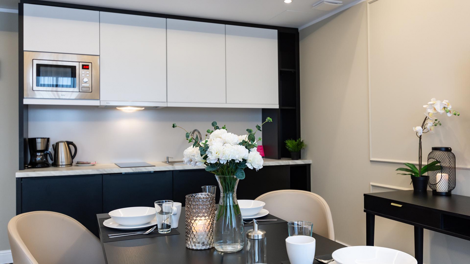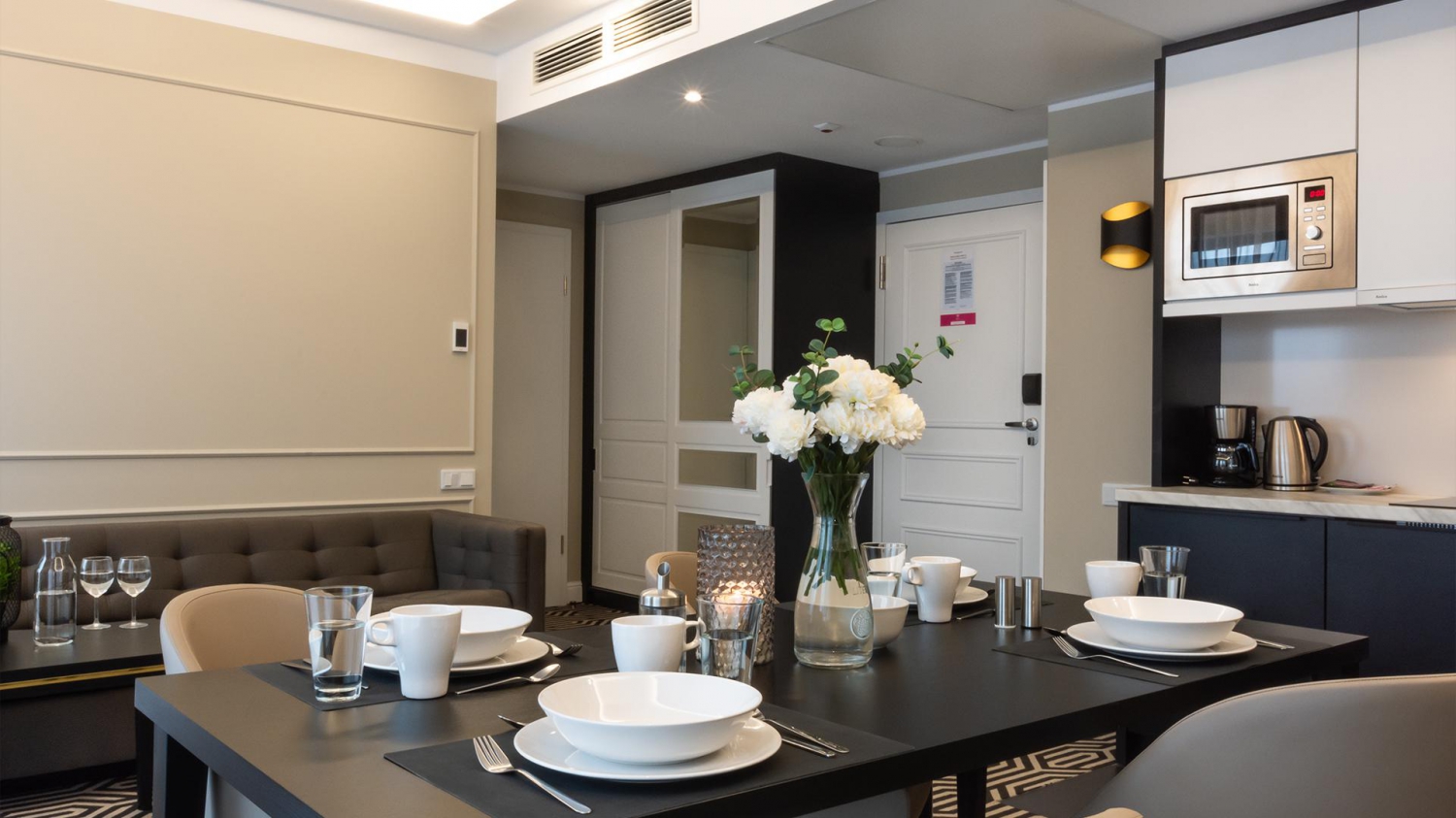 W apartamencie znajduje się w pełni wyposażony, nowoczesny i elegancki aneks kuchenny, idealny do wspólnego przygotowywania posiłków. Do dyspozycji Gości jest lodówka, zmywarka, płyta grzewcza, kuchenka mikrofalowa, ekspres do kawy, toster oraz komplet naczyń wraz z zestawem narzędzi kuchennych.
