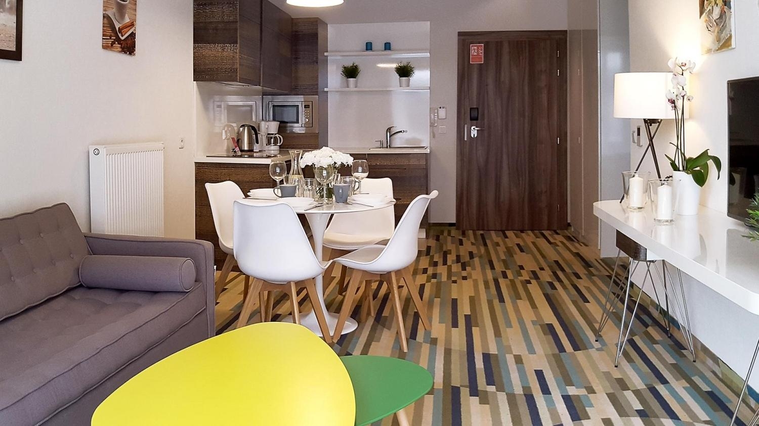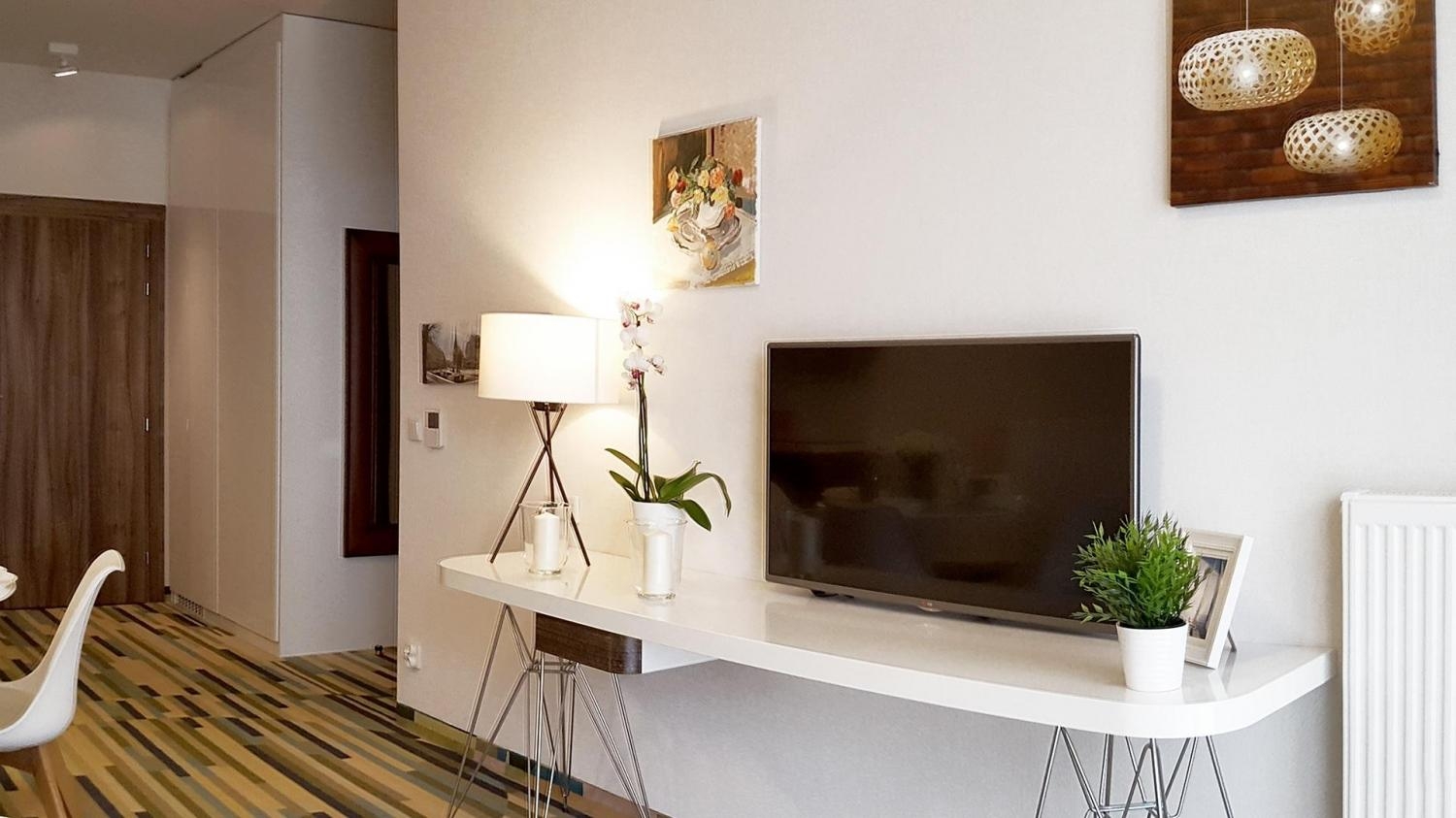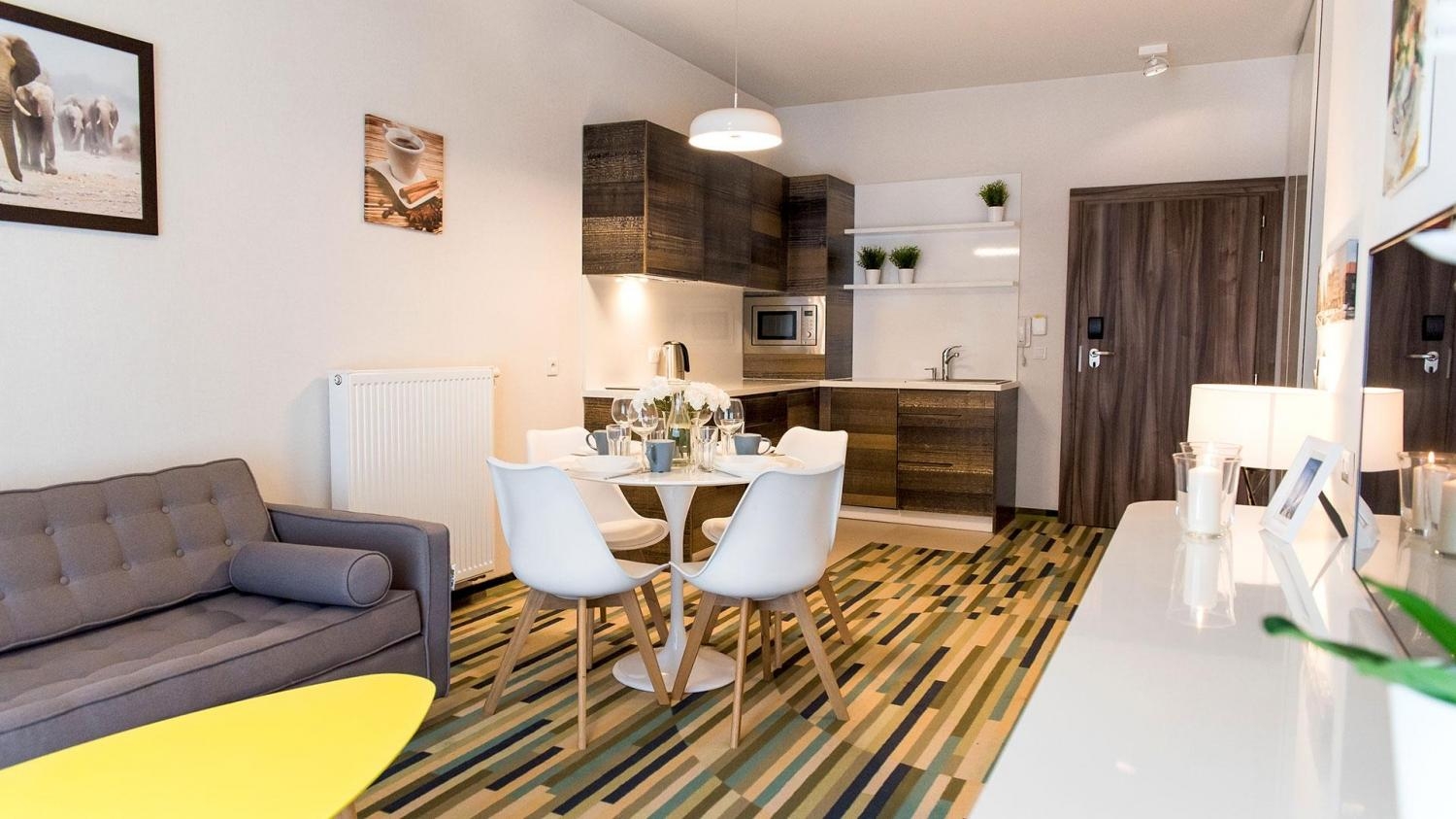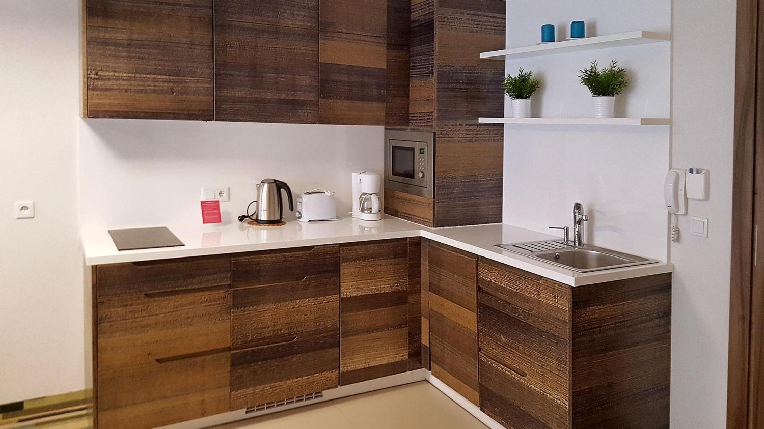 W apartamencie znajduje się bogato wyposażony aneks kuchenny, przystosowany do zaspokajania codziennych potrzeb. Do dyspozycji naszych Gości udostępniamy nowoczesny sprzęt AGD m.in. lodówkę, kuchenkę i mikrofalę, a także komplet naczyń, sztućce, akcesoria kuchenne, szklanki i kieliszki do wina - wszystko, co potrzebne, by samodzielnie przygotować posiłki i cieszyć się wspólnymi chwilami z bliskimi.