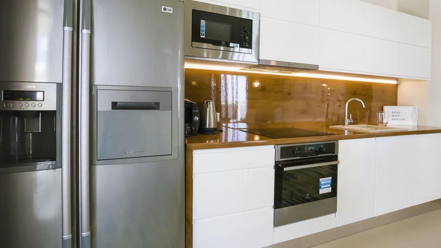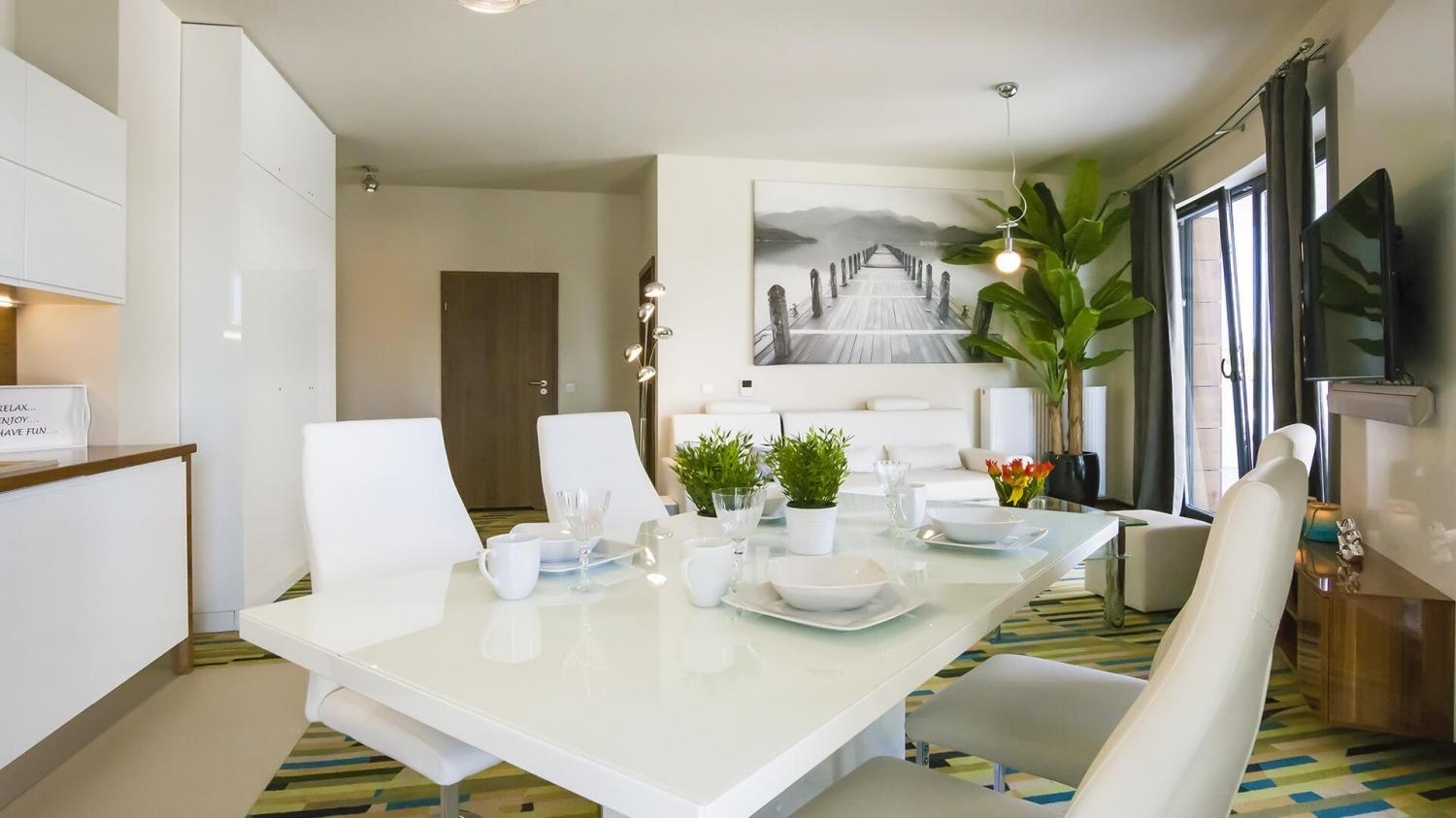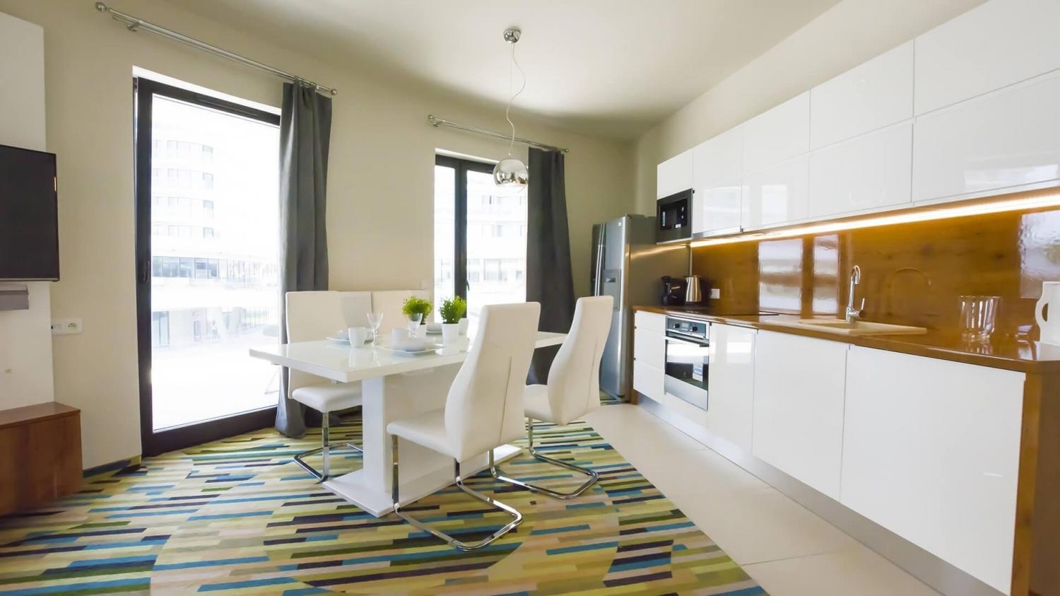 W apartamencie znajduje się bogato wyposażony aneks kuchenny, przystosowany do zaspokajania codziennych potrzeb. Do dyspozycji naszych Gości udostępniamy nowoczesny sprzęt AGD m.in. lodówkę, kuchenkę i mikrofalę, zmywarkę, ekspres a także komplet naczyń, sztućce, akcesoria kuchenne, szklanki i kieliszki do wina - wszystko, co potrzebne, by samodzielnie przygotować posiłki i cieszyć się wspólnymi chwilami z bliskimi.