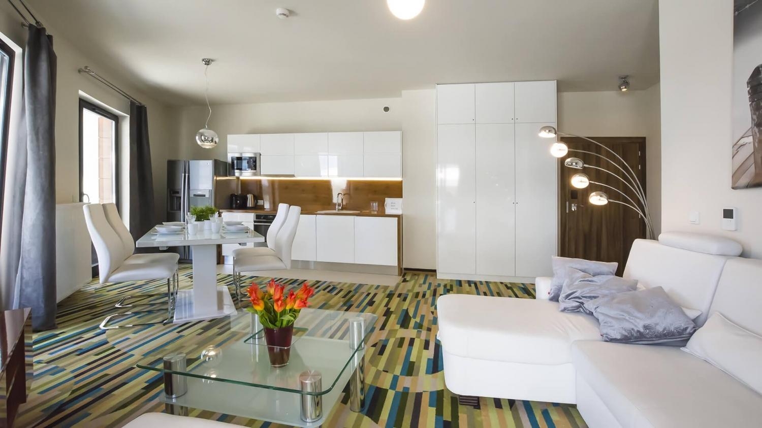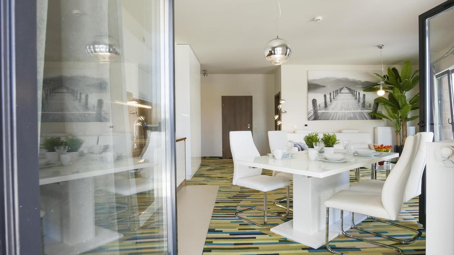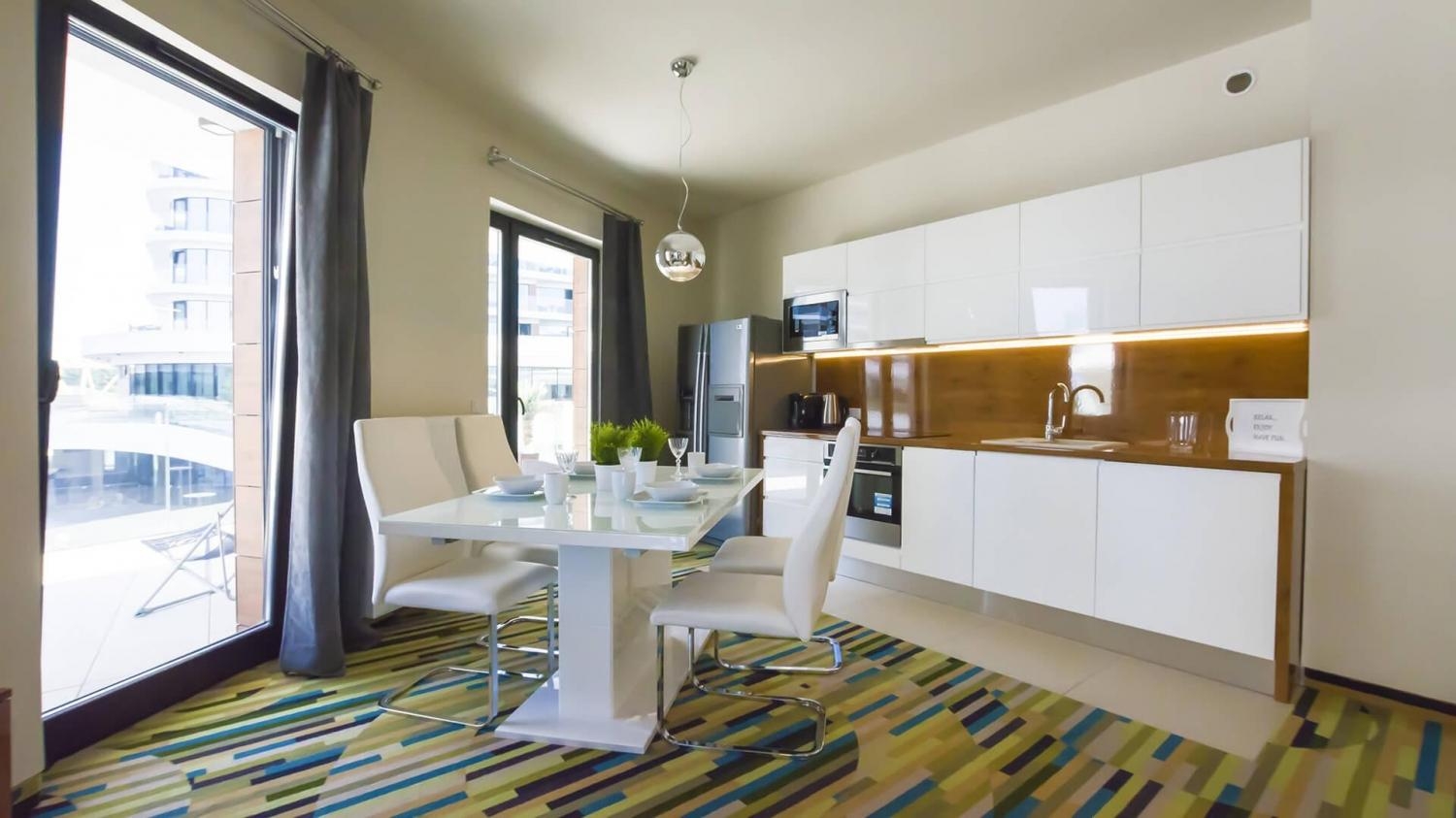 W apartamencie znajduje się bogato wyposażony aneks kuchenny, przystosowany do zaspokajania codziennych potrzeb. Do dyspozycji naszych Gości udostępniamy nowoczesny sprzęt AGD m.in. lodówkę, kuchenkę i mikrofalę, zmywarkę, ekspres a także komplet naczyń, sztućce, akcesoria kuchenne, szklanki i kieliszki do wina - wszystko, co potrzebne, by samodzielnie przygotować posiłki i cieszyć się wspólnymi chwilami z bliskimi.
