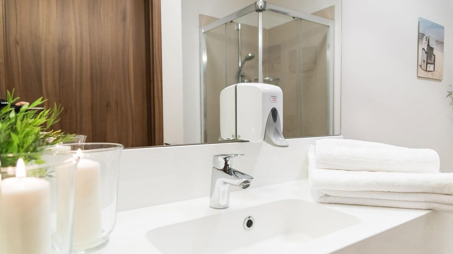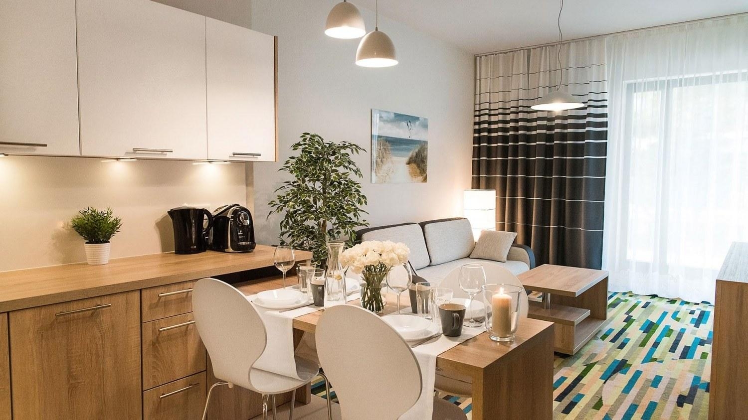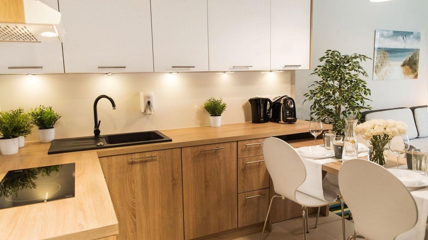 W apartamencie znajduje się bogato wyposażony aneks kuchenny, przystosowany do zaspokajania codziennych potrzeb. Do dyspozycji naszych Gości udostępniamy nowoczesny sprzęt AGD m.in. lodówkę, kuchenkę i mikrofalę, a także komplet naczyń, sztućce, akcesoria kuchenne, szklanki i kieliszki do wina - wszystko, co potrzebne, by samodzielnie przygotować posiłki i cieszyć się wspólnymi chwilami z bliskimi.