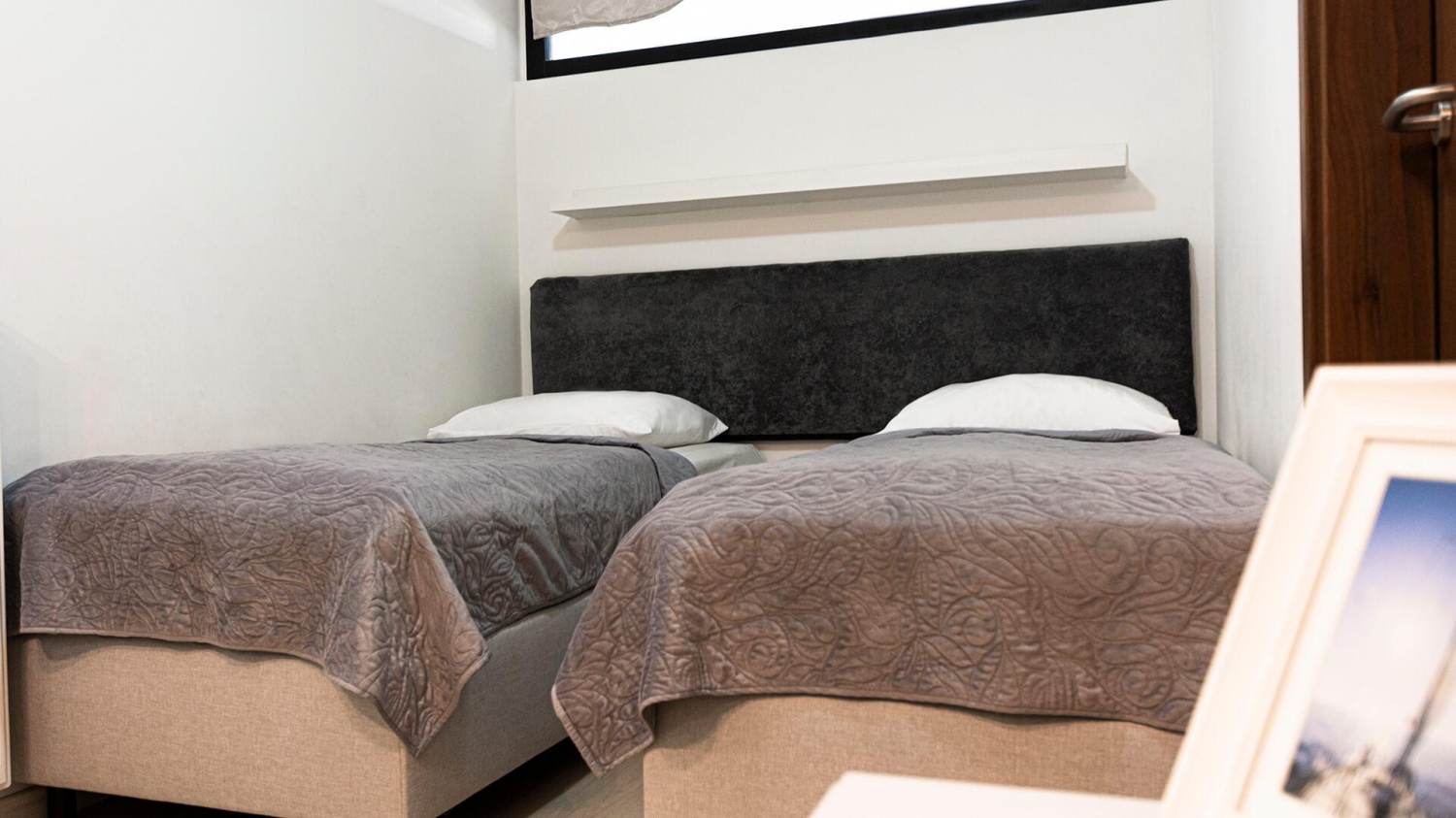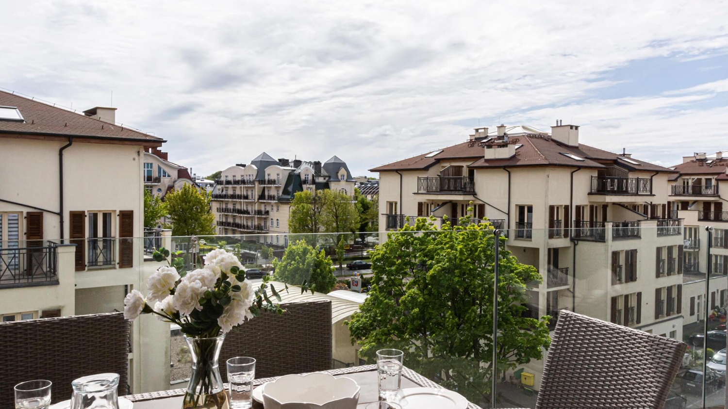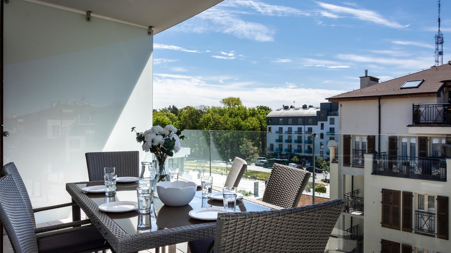 Ten bardzo jasny i elegancko urządzony apartament, oprócz doskonałego położenia i południowej ekspozycji, posiada przestronny taras ze stołem dla 6. osób i bujanym koszem oraz pięknym widokiem na górującą wieżę hotelu Radisson Blu Resort, Świnoujście. W skład pomieszczeń wchodzi hol; sypialnia z szafą wnękową, toaletką i dwoma pojedynczymi łóżkami, które można w razie potrzeby złączyć; sypialnia z dużym łóżkiem małżeńskim, szafą w zabudowie i drzwiami balkonowymi na taras; salon z rozkładaną kanapą; łazienka z kabiną prysznicową oraz aneks kuchenny ze stołem i krzesłami. Do dyspozycji Gości jest telewizja oraz bezpłatny bezprzewodowy dostęp do Internetu. Do apartamentu przynależy miejsce parkingowe zewnętrzne nr 9. Dla Rodziny lub Przyjaciół, by byli blisko, istnieje możliwość rezerwacji innych apartamentów w budynku.