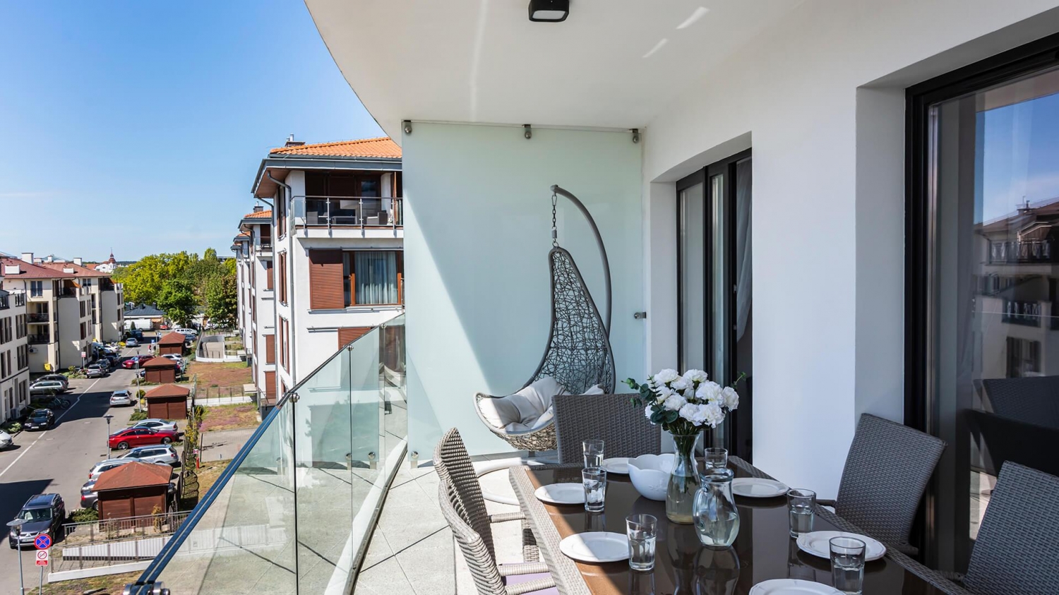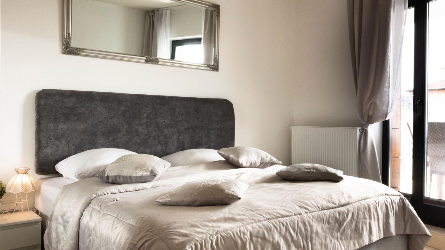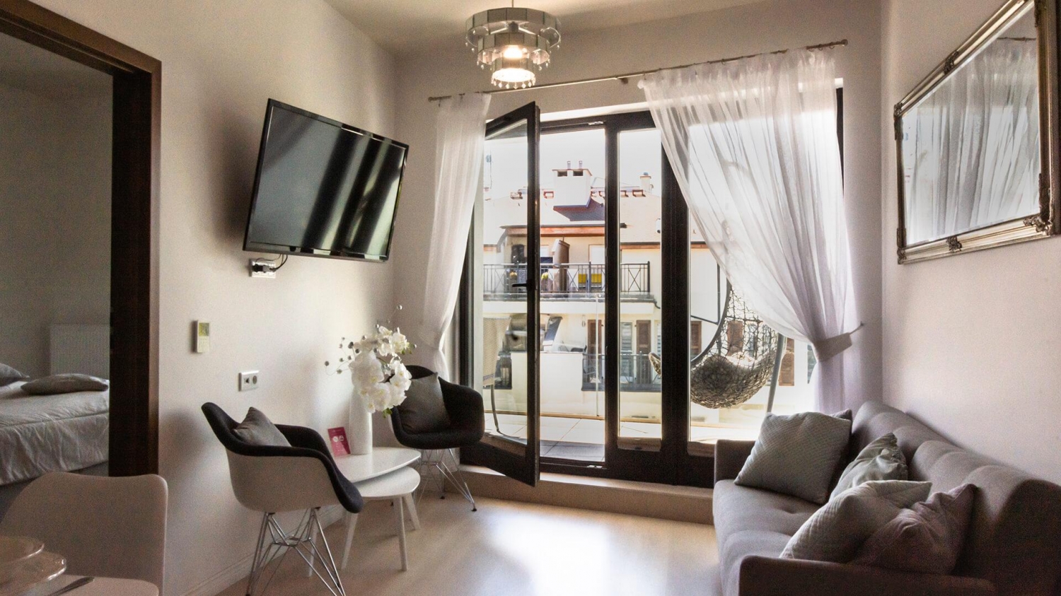Ten bardzo jasny i elegancko urządzony apartament, oprócz doskonałego położenia i południowej ekspozycji, posiada przestronny taras ze stołem dla 6. osób i bujanym koszem oraz pięknym widokiem na górującą wieżę hotelu Radisson Blu Resort, Świnoujście. W skład pomieszczeń wchodzi hol; sypialnia z szafą wnękową, toaletką i dwoma pojedynczymi łóżkami, które można w razie potrzeby złączyć; sypialnia z dużym łóżkiem małżeńskim, szafą w zabudowie i drzwiami balkonowymi na taras; salon z rozkładaną kanapą; łazienka z kabiną prysznicową oraz aneks kuchenny ze stołem i krzesłami. Do dyspozycji Gości jest telewizja oraz bezpłatny bezprzewodowy dostęp do Internetu. Do apartamentu przynależy miejsce parkingowe zewnętrzne nr 9. Dla Rodziny lub Przyjaciół, by byli blisko, istnieje możliwość rezerwacji innych apartamentów w budynku.