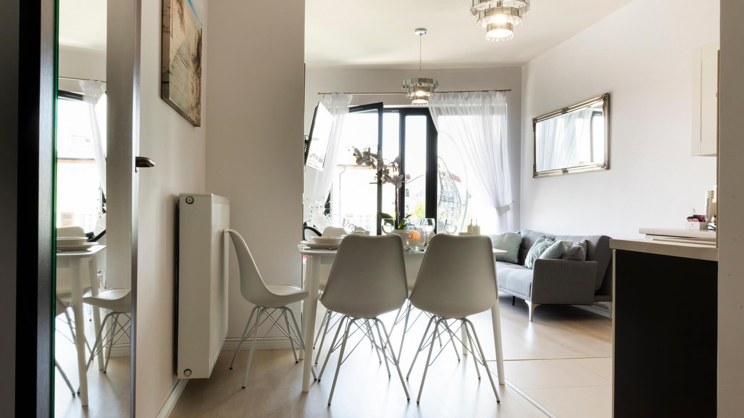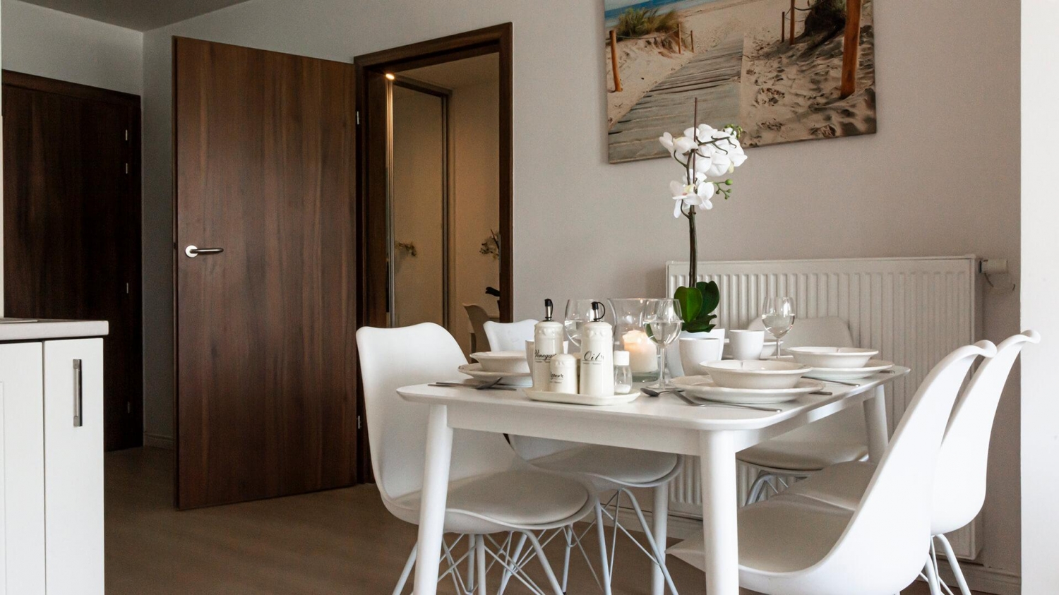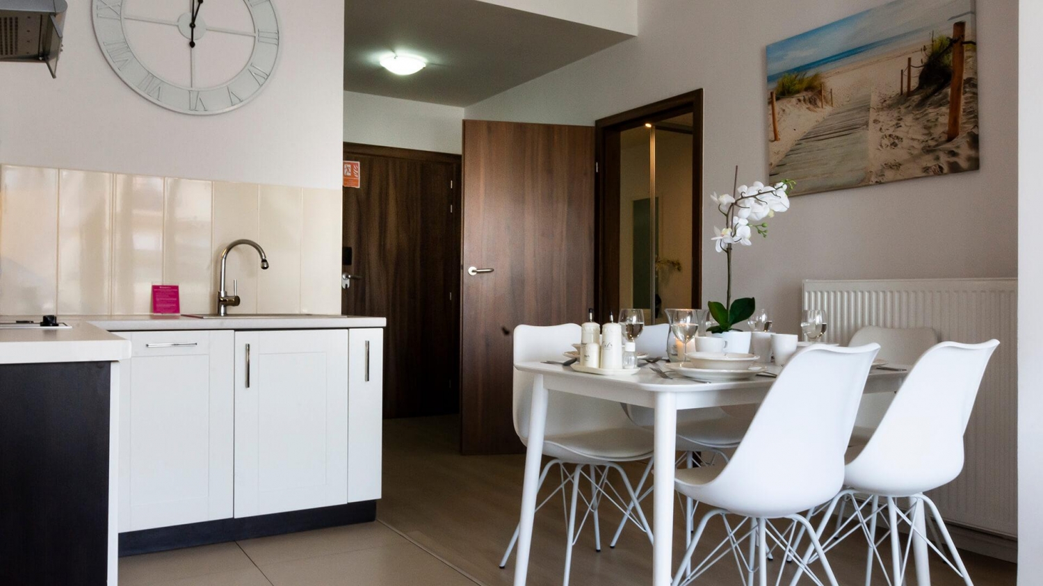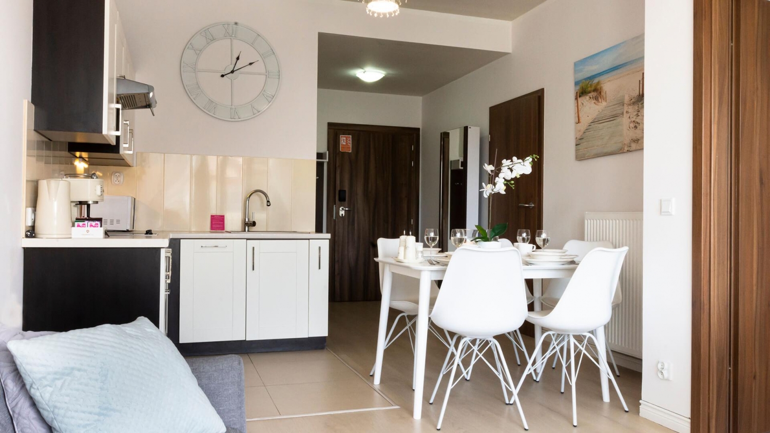 W apartamencie znajduje się w pełni wyposażony aneks kuchenny idealny do wspólnego przygotowywania posiłków z bliskimi. Do dyspozycji Gości są: lodówka, zmywarka, płyta grzewcza, kuchenka mikrofalowa, ekspres do kawy oraz komplet naczyń wraz z zestawem narzędzi kuchennych, potrzebnych do wspólnego biesiadowania, również na słonecznym tarasie z pięknym widokiem.