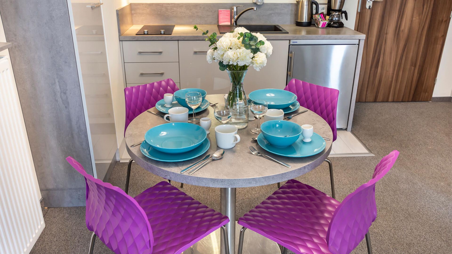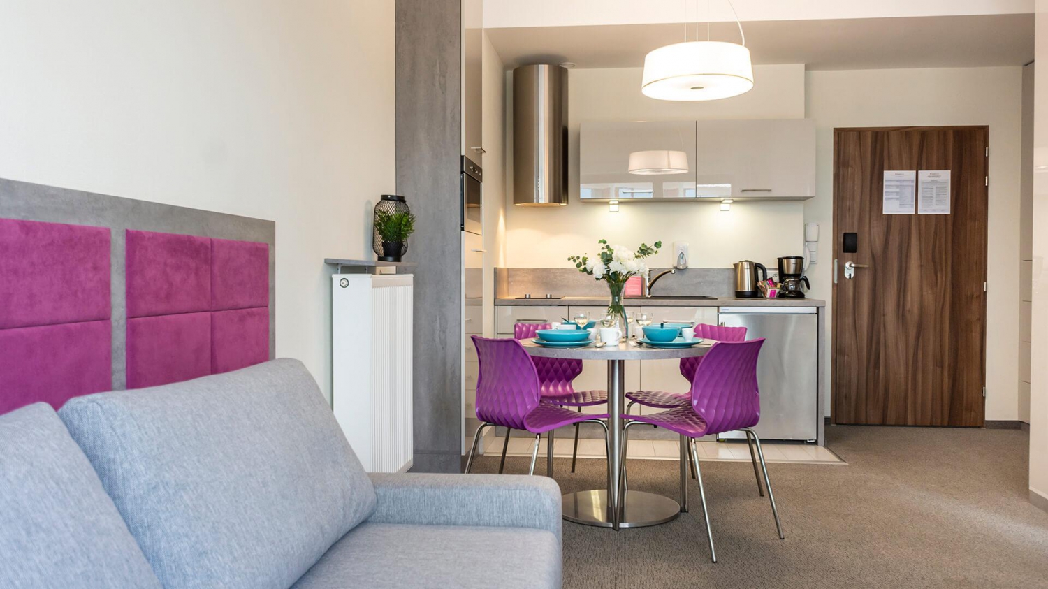 W apartamencie znajduje się bogato wyposażony aneks kuchenny, przystosowany do zaspokajania codziennych potrzeb. Do dyspozycji naszych Gości udostępniamy nowoczesny sprzęt AGD m.in. lodówkę, kuchenkę, a także komplet naczyń, sztućce, akcesoria kuchenne, szklanki i kieliszki do wina - wszystko, co potrzebne, by samodzielnie przygotować posiłki i cieszyć się wspólnymi chwilami z bliskimi.