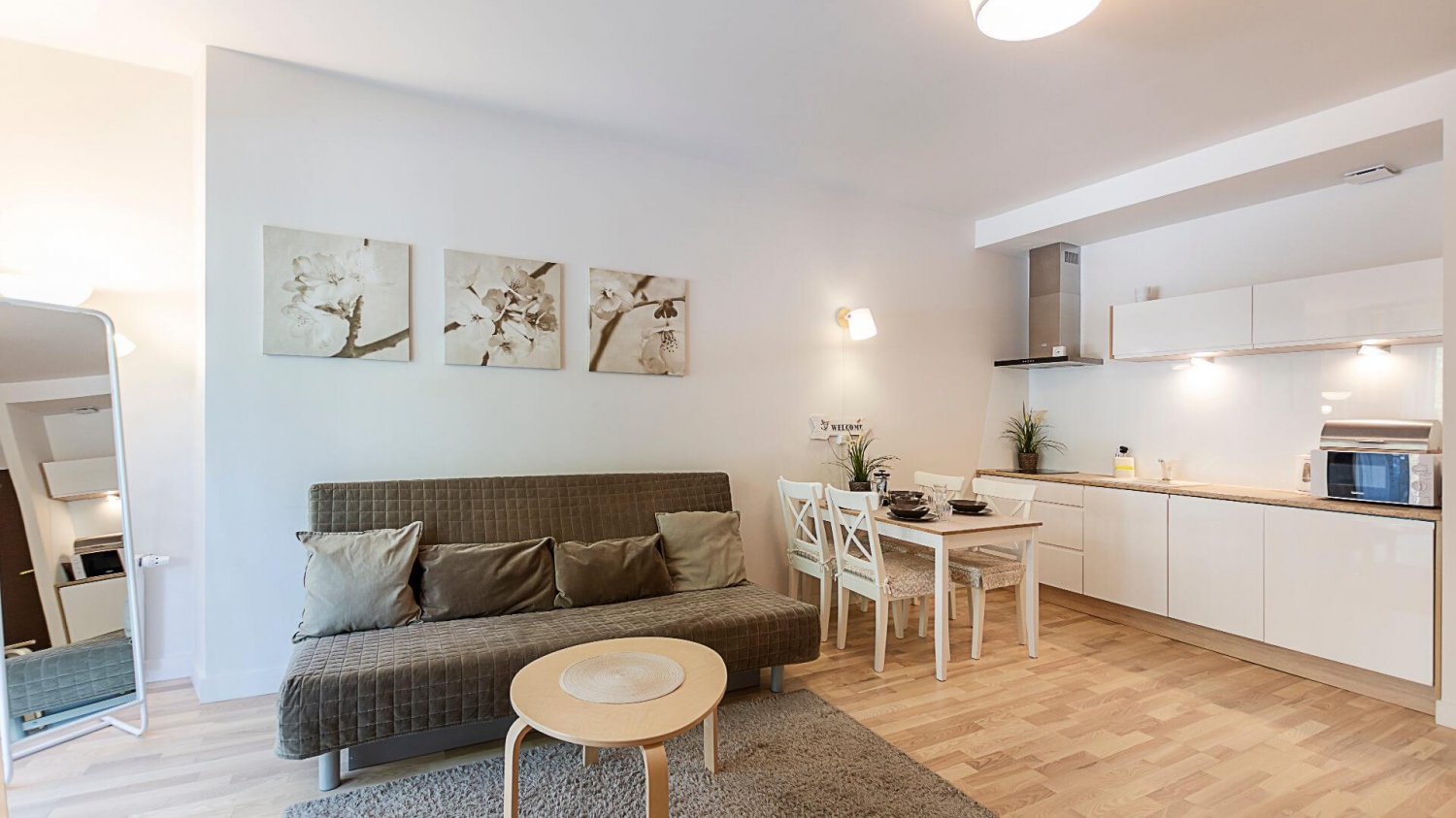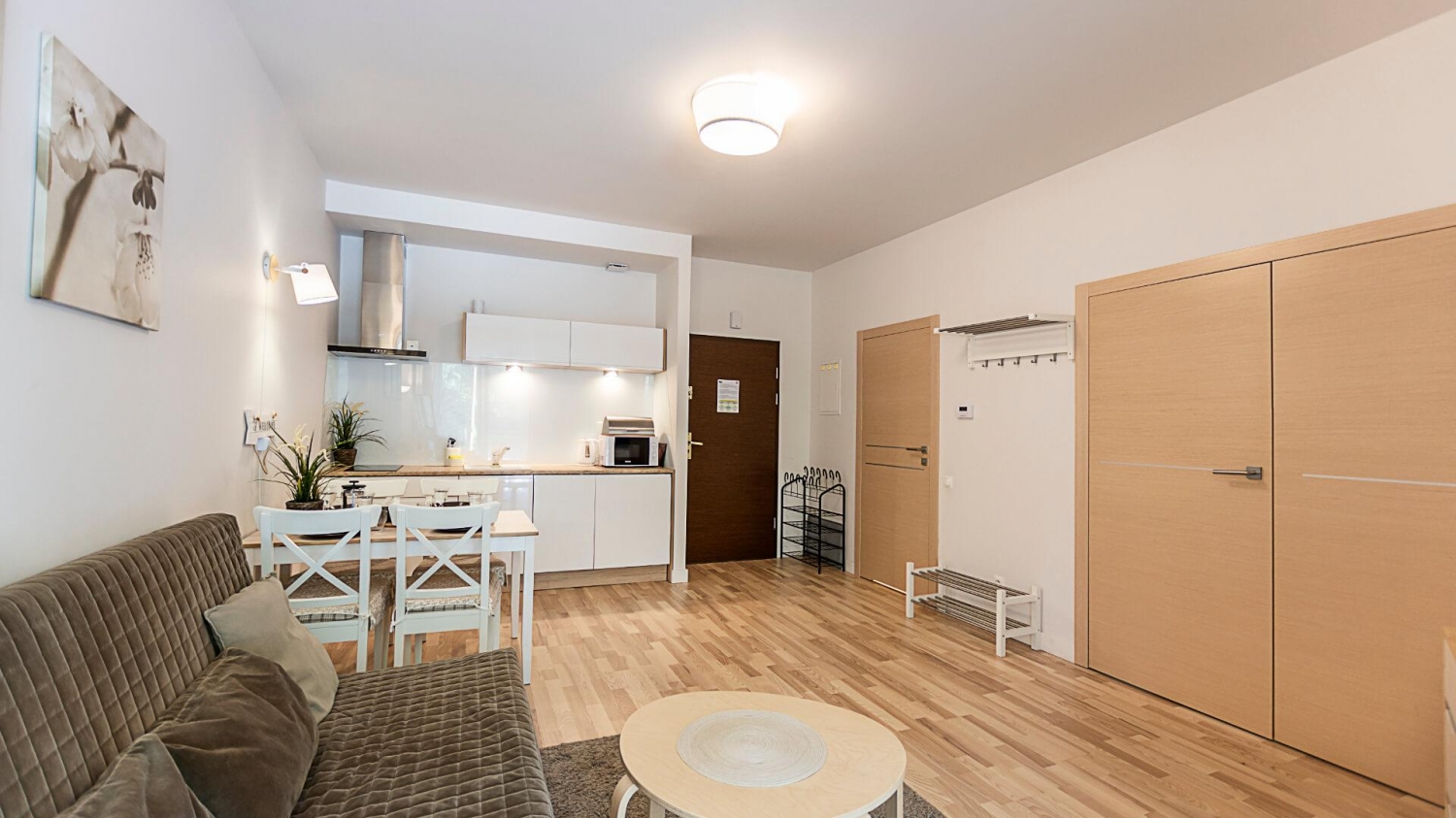 W apartamencie znajduje się komfortowy, w pełni wyposażony aneks kuchenny gotowy na wspólne biesiadowanie z bliskimi. Do dyspozycji Gości jest lodówka, zmywarka, płyta grzewcza, czajnik elektryczny, a także komplet naczyń wraz z zestawem narzędzi kuchennych potrzebnych do samodzielnego przygotowywania i spożywania posiłków.