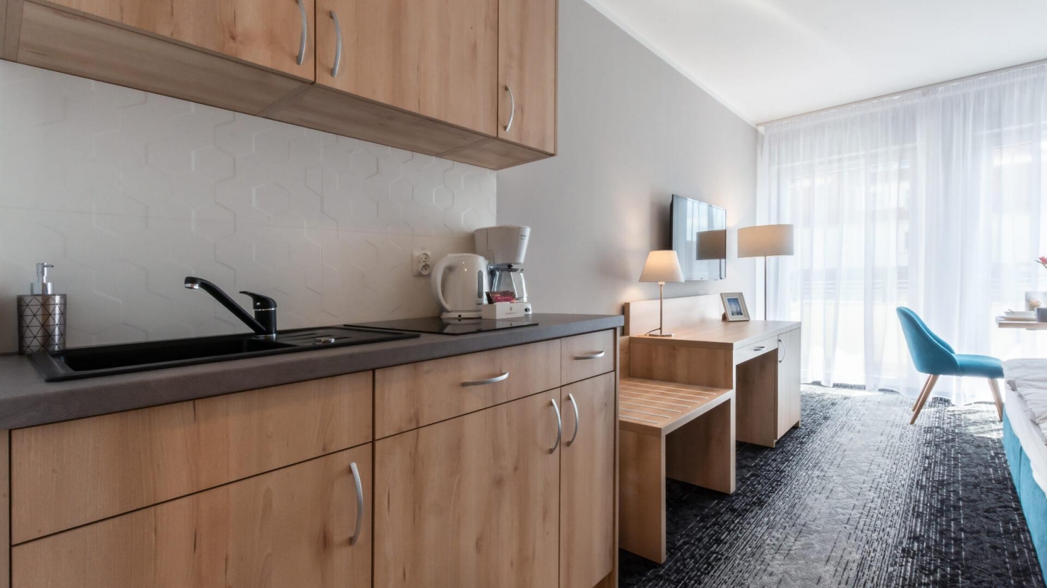 W apartamencie znajduje się mini aneks kuchenny. Do dyspozycji  Gości jest sprzęt AGD: lodówka, płyta grzewcza, czajnik elektryczny, ekspres do kawy, komplet naczyń, sztućce, szklanki, kieliszki do wina oraz akcesoria kuchenne niezbędne do samodzielnego przygotowywania posiłków.