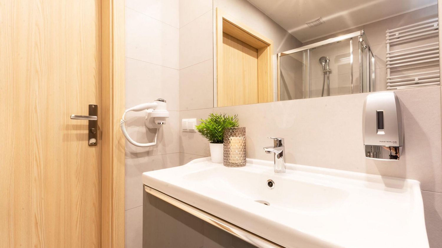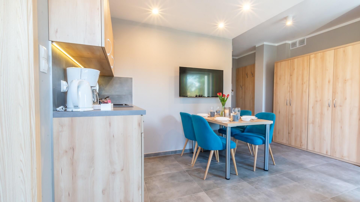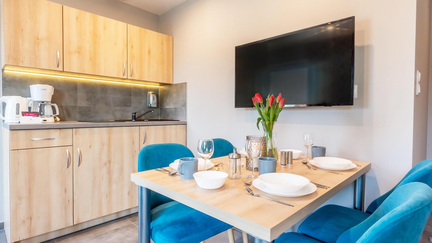 W apartamencie znajduje się mini aneks kuchenny przystosowany do przyrządzania posiłków przez Gości. Do dyspozycji jest lodówka, płyta grzewcza, czajnik elektryczny, ekspres do kawy, a także komplet naczyń, sztućce, szklanki, kieliszki do wina oraz wszystkie inne akcesoria kuchenne, niezbędne do samodzielnego przygotowania posiłków.