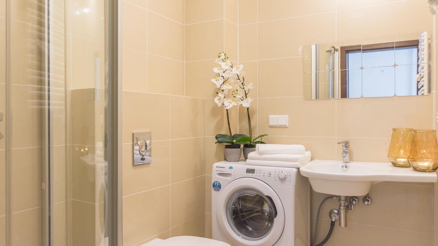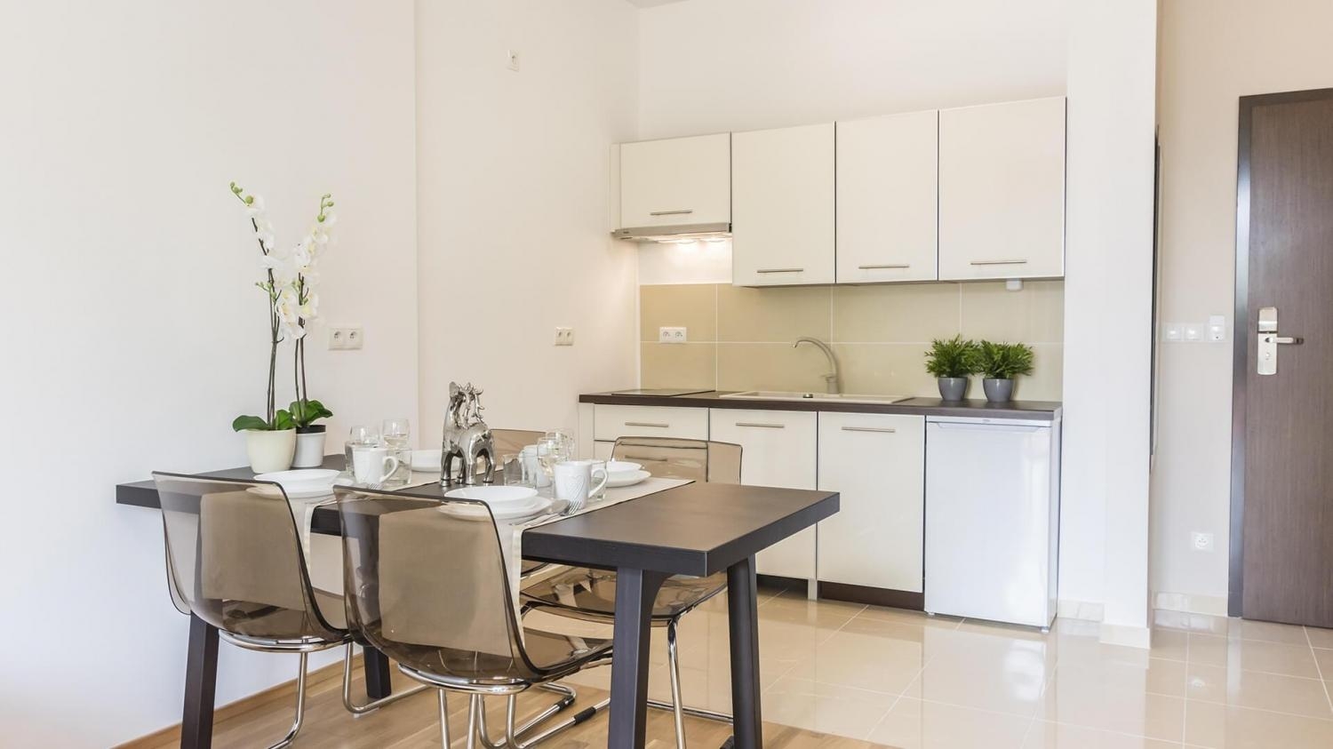 W apartamencie znajduje się także doskonale wyposażony aneks kuchenny przystosowany do zaspokajania codziennych potrzeb. Do dyspozycji naszych Gości udostępniamy nowoczesny sprzęt AGD m.in. lodówkę, kuchenkę z okapem, zmywarkę oraz komplet naczyń, sztućce, akcesoria kuchenne, szklanki i kieliszki do wina. Wszystko, co potrzebne by samodzielnie przygotować posiłki i cieszyć się wspólnymi chwilami z bliskimi.