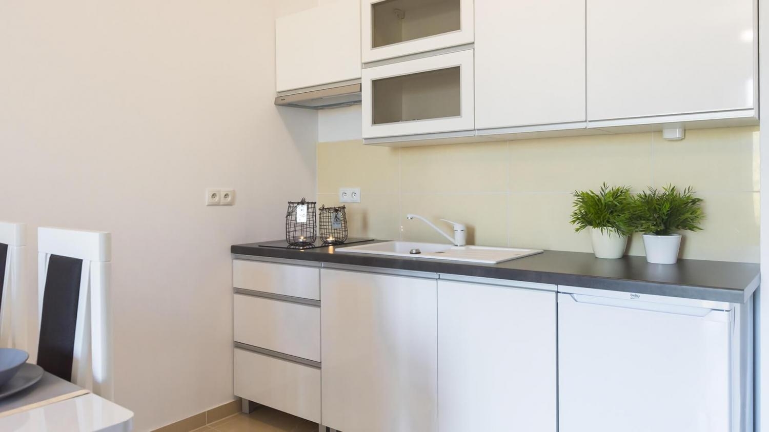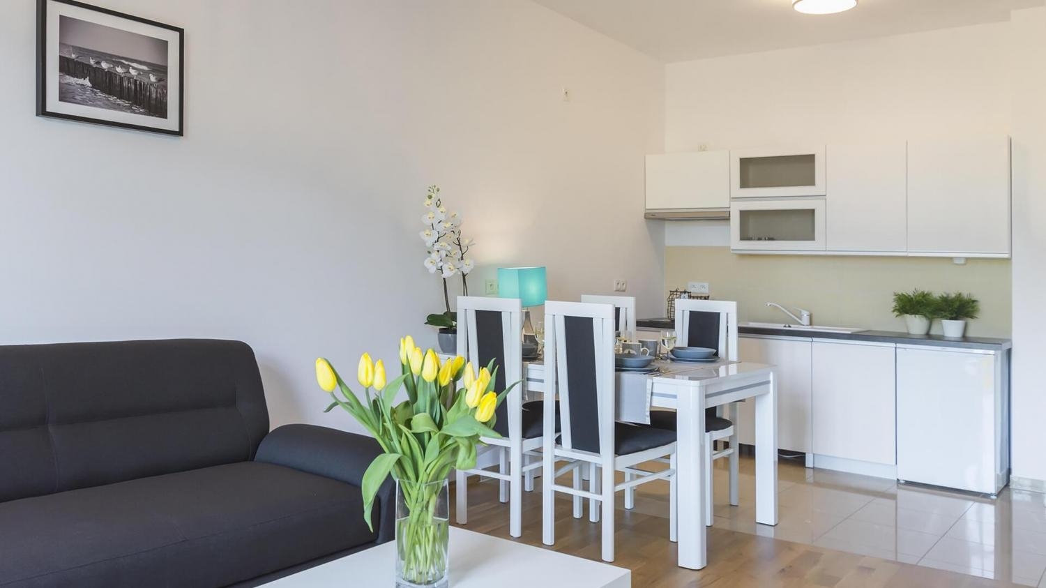W apartamencie znajduje się także doskonale wyposażony aneks kuchenny przystosowany do zaspokajania codziennych potrzeb. Do dyspozycji naszych Gości udostępniamy nowoczesny sprzęt AGD m.in. lodówkę, kuchenkę z okapem, zmywarkę oraz komplet naczyń, sztućce, akcesoria kuchenne, szklanki i kieliszki do wina. Wszystko, co potrzebne by samodzielnie przygotować posiłki i cieszyć się wspólnymi chwilami z bliskimi.
