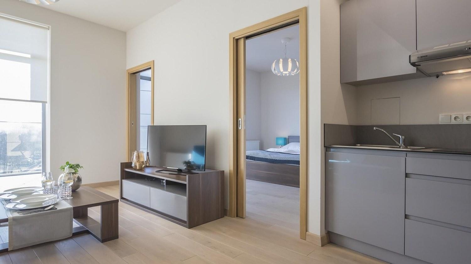 W apartamencie znajduje się także bogato wyposażony aneks kuchenny przystosowany do zaspokajania codziennych potrzeb. Do dyspozycji naszych Gości udostępniamy nowoczesny sprzęt AGD m.in. lodówkę, kuchenkę oraz komplet naczyń, sztućce, akcesoria kuchenne, szklanki i kieliszki do wina. Wszystko, co potrzebne by samodzielnie przygotować posiłki i cieszyć się wspólnymi chwilami z bliskimi.