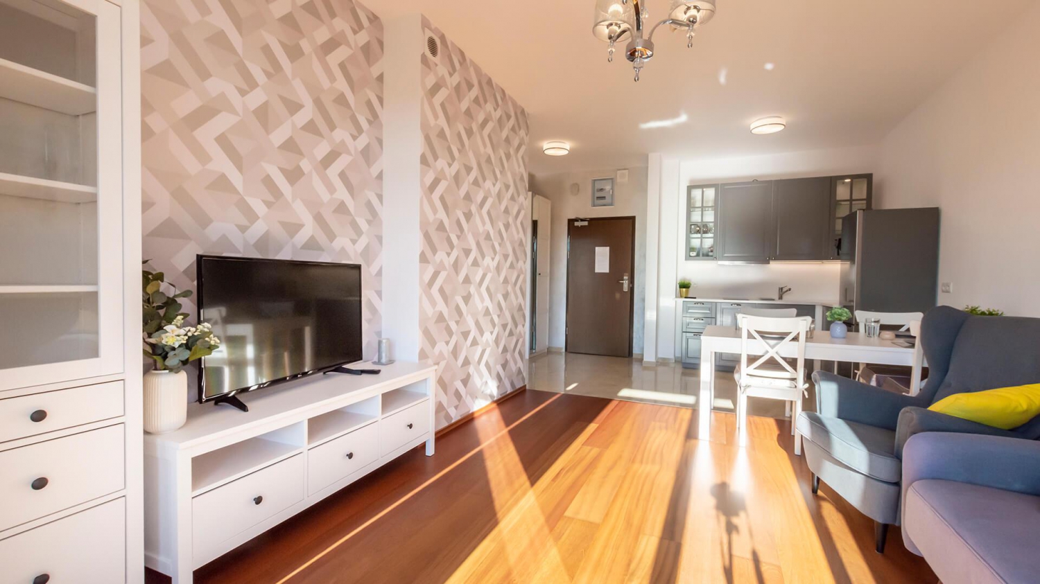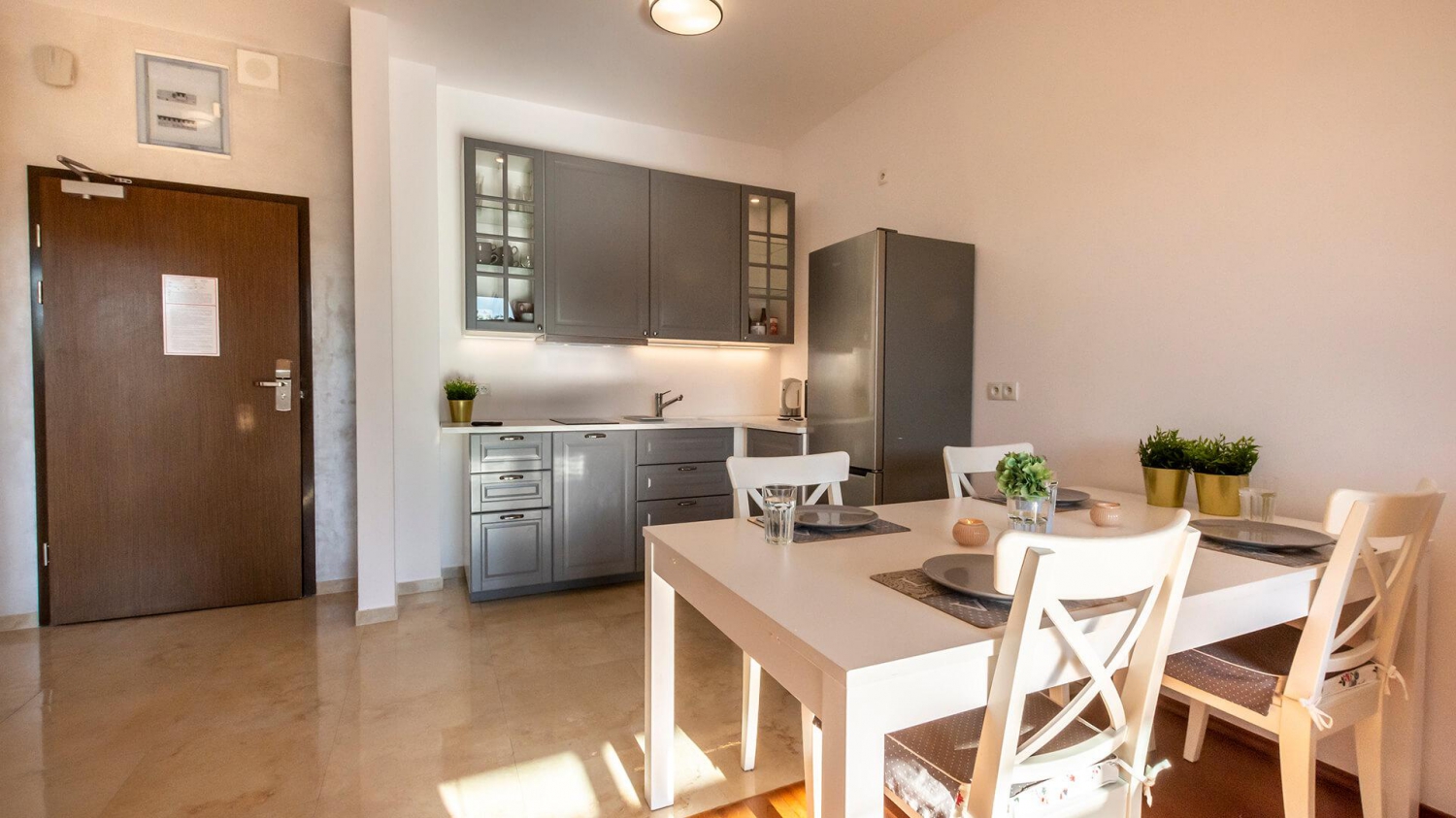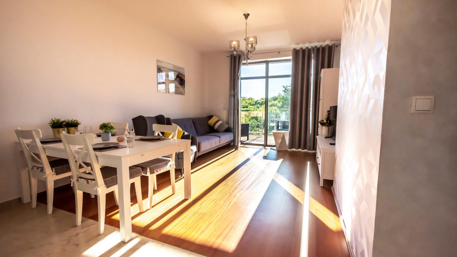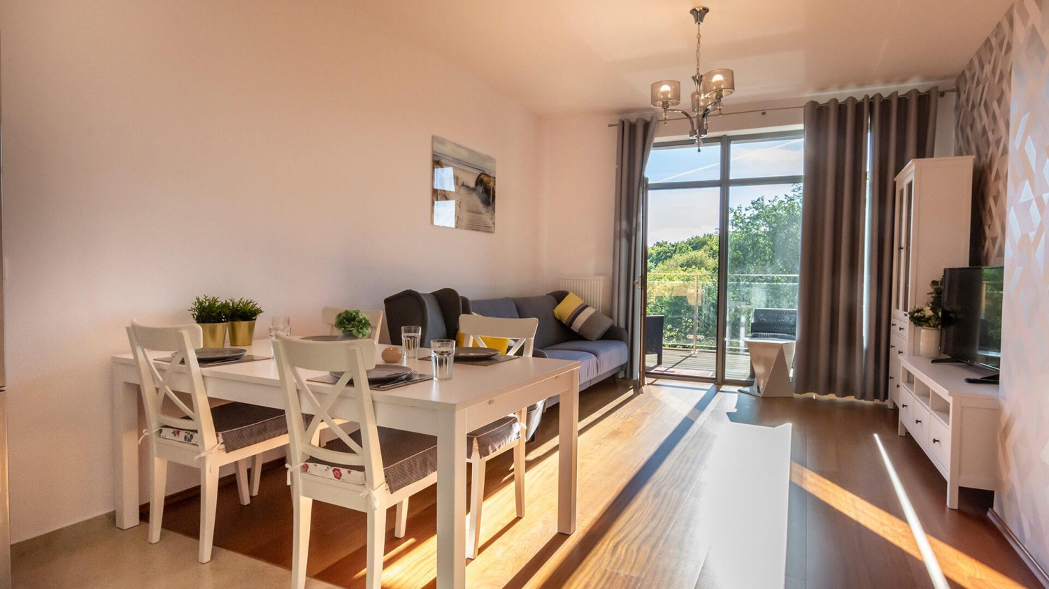 W apartamencie znajduje się także doskonale wyposażony aneks kuchenny, przystosowany do zaspokajania codziennych potrzeb. Do dyspozycji naszych Gości udostępniamy nowoczesny sprzęt AGD m.in. lodówkę, kuchenkę z okapem, zmywarkę oraz komplet naczyń, sztućce, akcesoria kuchenne, szklanki i kieliszki do wina. Wszystko, co potrzebne by samodzielnie przygotować posiłki i cieszyć się wspólnymi chwilami z bliskimi.
