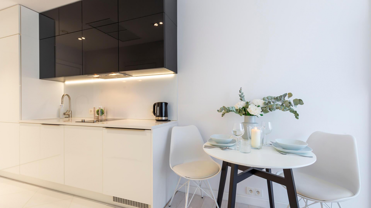 Do dyspozycji Gości jest nowoczesny aneks kuchenny z lodówką, zmywarką oraz kompletem naczyń i akcesoriami kuchennymi, szklanki i kieliszki do wina. Wszystko co niezbędne, aby samodzielnie przygotować posiłki i cieszyć się wspólnymi chwilami w gronie rodziny lub znajomych.