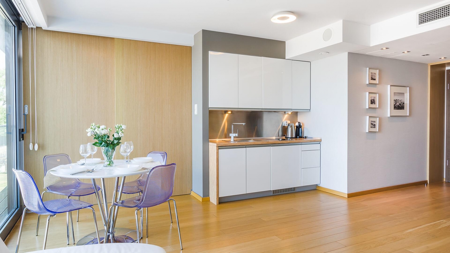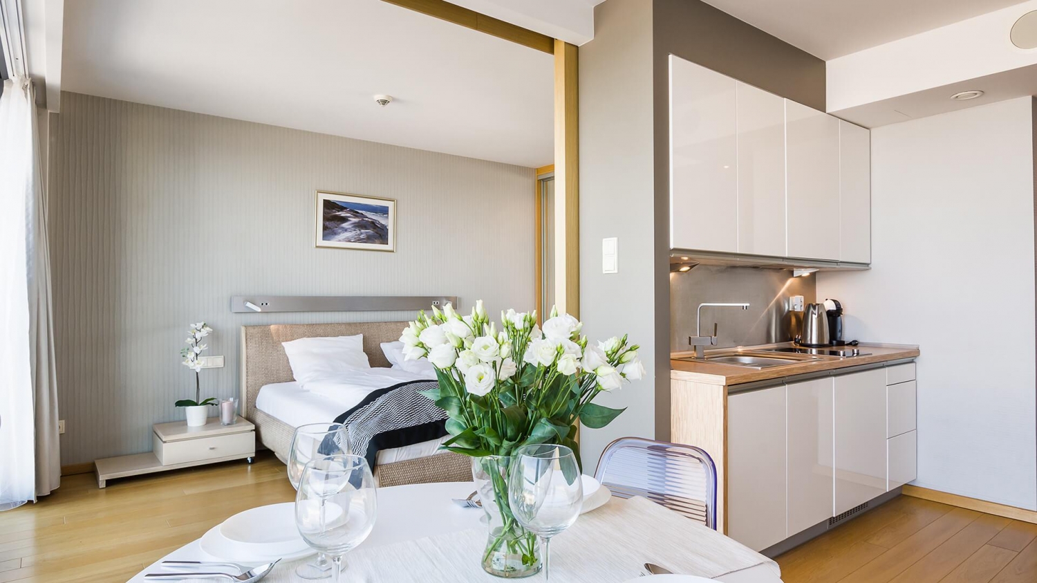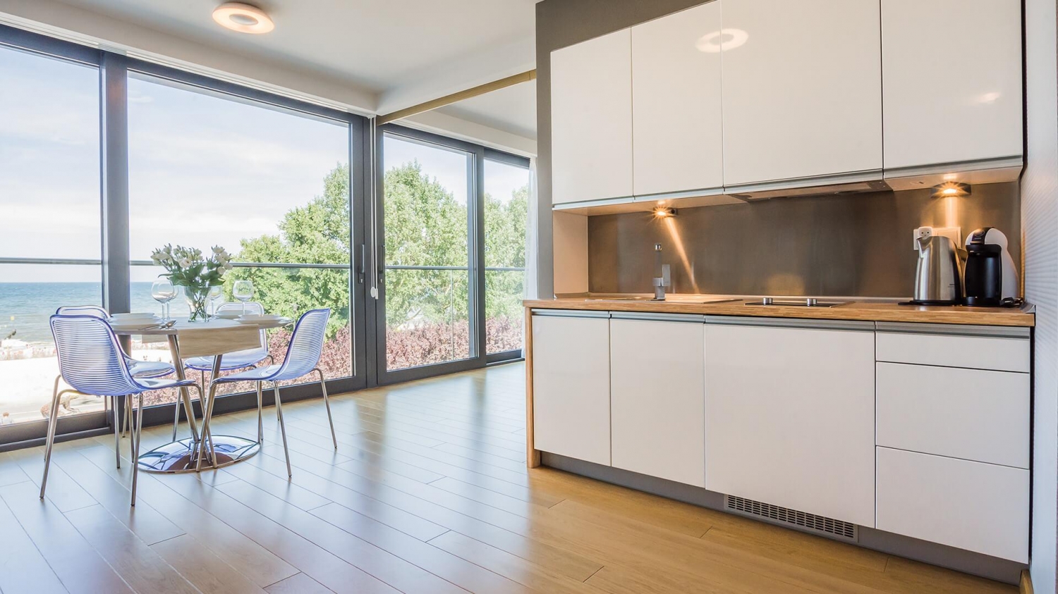W apartamencie znajduje się doskonale wyposażony aneks kuchenny przystosowany do zaspokajania codziennych potrzeb. Do dyspozycji Gości są sprzęty AGD m.in. lodówka, zmywarka, płyta indukcyjna, mikrofala oraz komplet naczyń, sztućce, akcesoria kuchenne, szklanki i kieliszki do wina. Wszystko, co potrzebne by samodzielnie przygotować posiłki i cieszyć się wspólnymi chwilami z bliskimi.