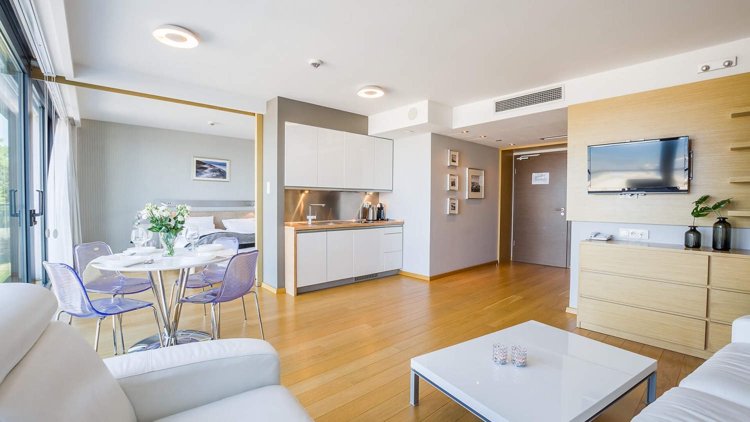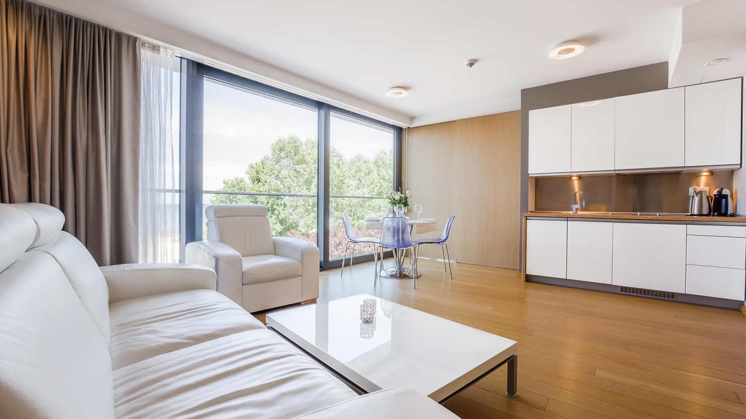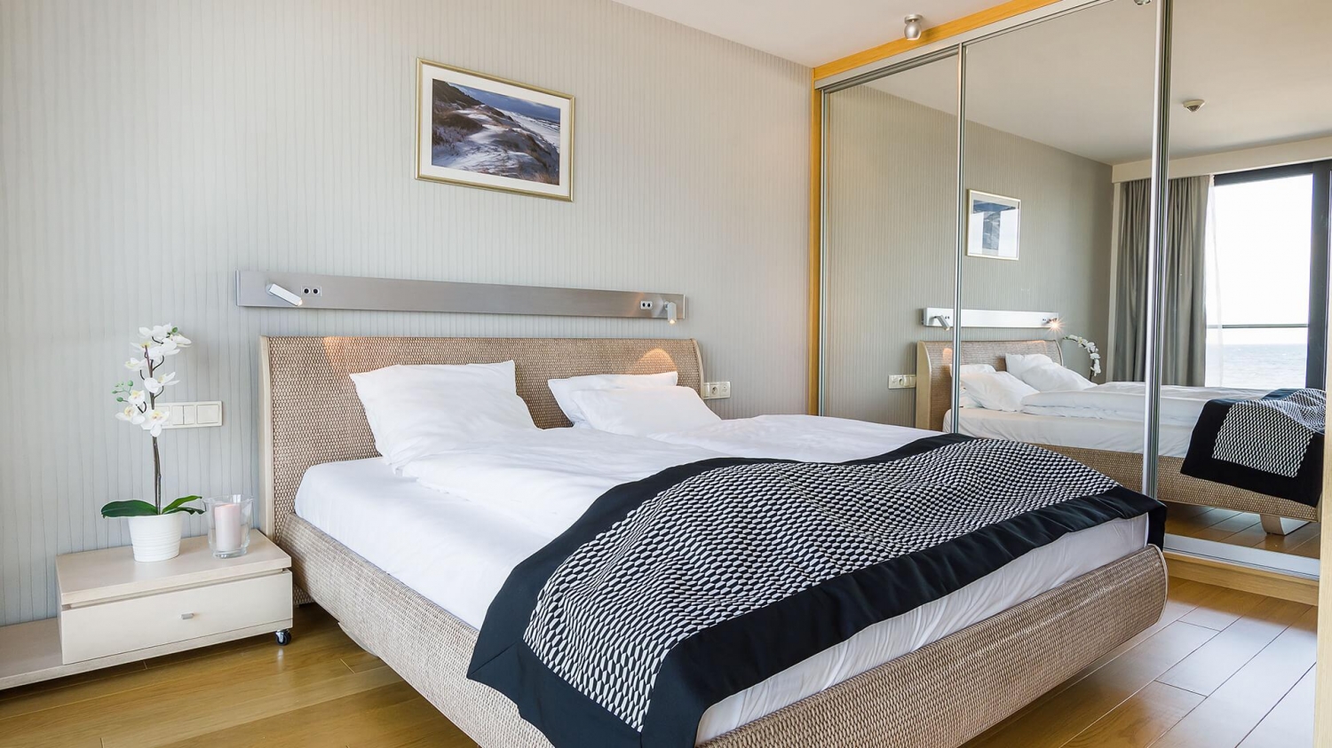 Marine Hotel★★★★★ Apartament 221 zachwyca designem i wygodą, ale jego największym atutem jest bezpośredni widok na morze i złocistą plażę – trudno o bardziej komfortową lokalizację, która pozwala cieszyć się purpurą zachodzącego słońca i przyjemnym szumem fal o poranku. Hotel położony jest w sąsiedztwie Ekoparku oraz zacienionej trasy rowerowej do Portu Morskiego lub w przeciwnym kierunku do Podczela z niesamowitymi widokami na wydmy. Dogodna lokalizacja budynku zapewnia dobry dojazd zarówno do dworca kolejowego, jak i autobusowego.