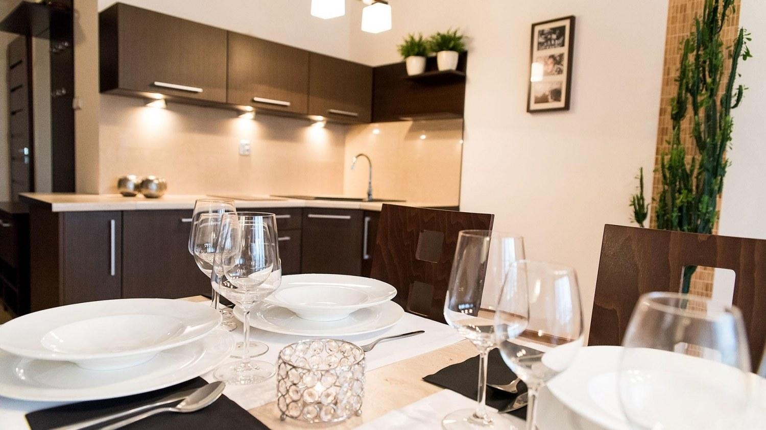 W apartamencie znajduje się także doskonale wyposażony aneks kuchenny przystosowany do zaspokajania codziennych potrzeb. Do dyspozycji naszych Gości udostępniamy sprzęt AGD m.in. lodówkę, kuchenkę oraz komplet naczyń, sztućce, akcesoria kuchenne, szklanki i kieliszki do wina. Wszystko, co potrzebne by samodzielnie przygotować posiłki i cieszyć się wspólnymi chwilami z bliskimi.