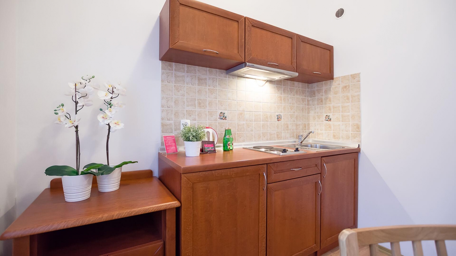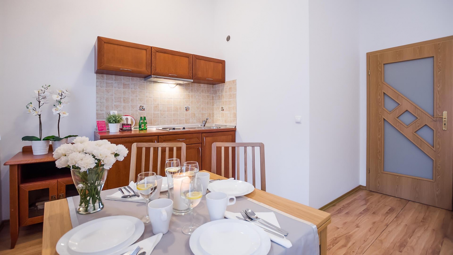 W apartamencie znajduje się dobrze wyposażony aneks kuchenny. Do dyspozycji naszych Gości udostępniamy sprzęt AGD m.in. lodówkę, zmywarkę, mikrofalę, płytę indukcyjną oraz komplet naczyń, sztućce, akcesoria kuchenne, szklanki i kieliszki do wina.