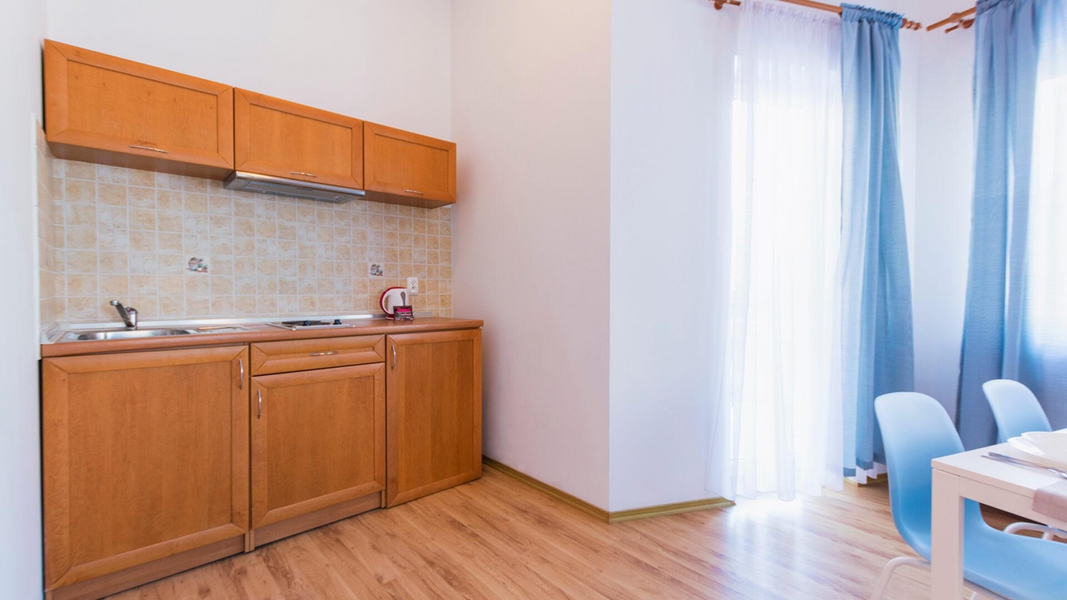 W apartamencie znajduje się aneks kuchenny. Do dyspozycji naszych Gości udostępniamy sprzęt AGD m.in. lodówkę, płytę kuchenną oraz komplet naczyń, sztućce, akcesoria kuchenne, szklanki i kieliszki do wina.