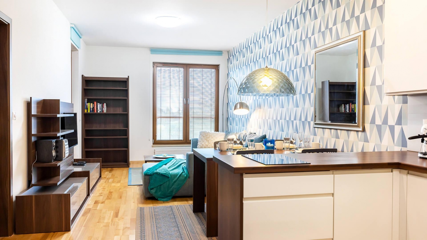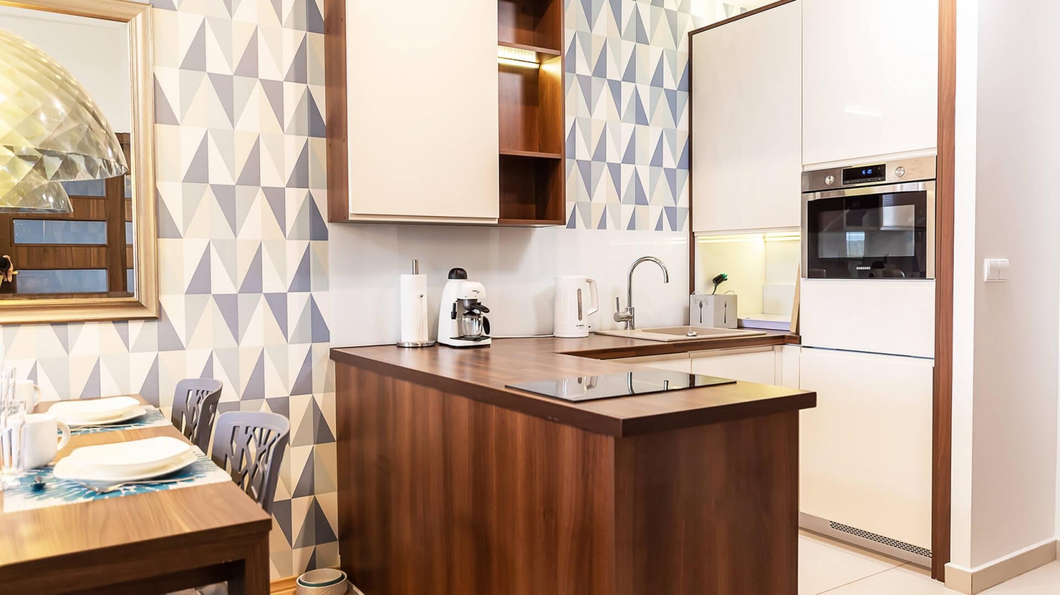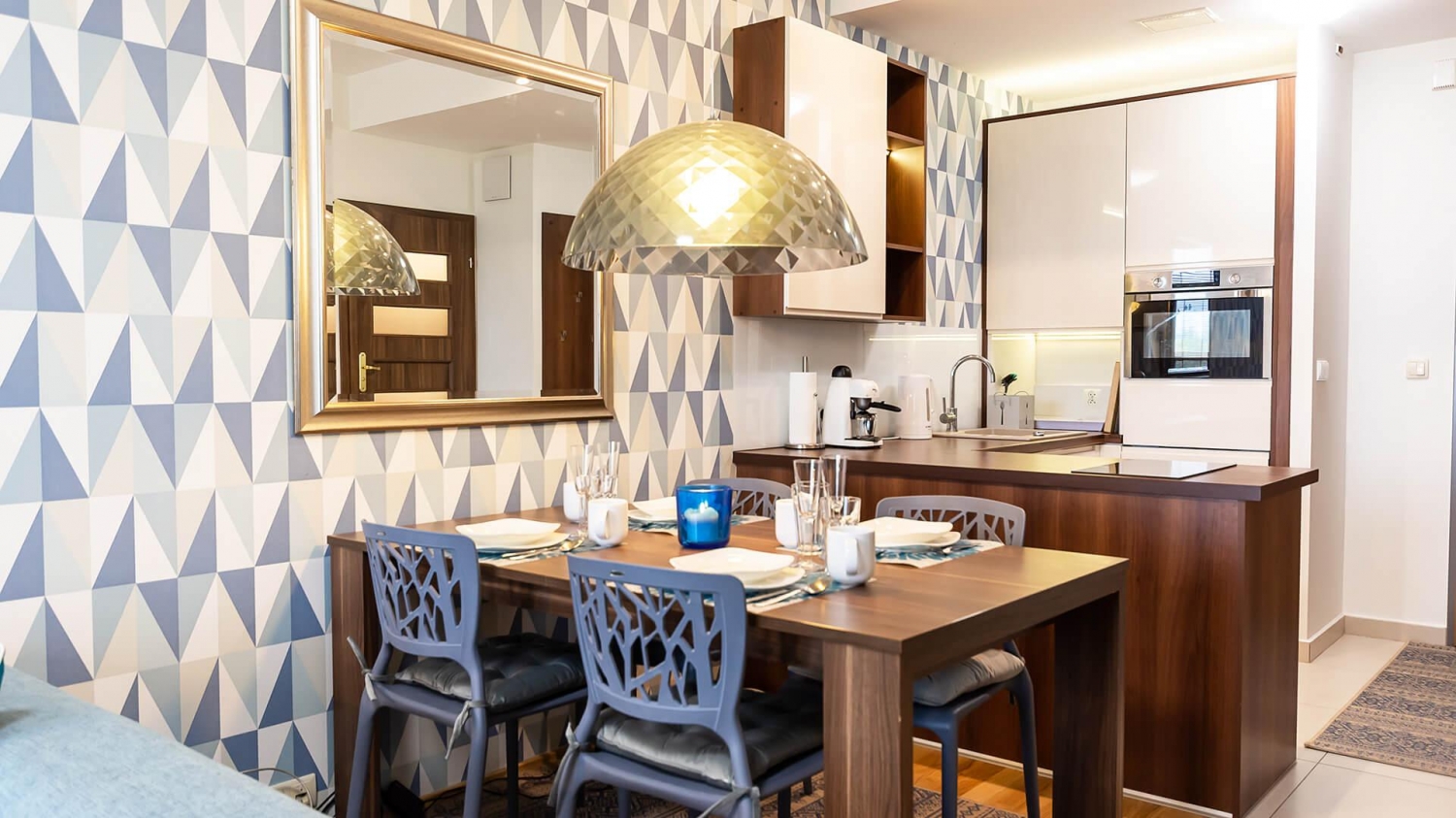 Do dyspozycji naszych Gości jest nowoczesny aneks kuchenny z lodówką, piekarnikiem, kuchenką mikrofalową, zmywarką, ekspresem do kawy oraz kompletem naczyń i akcesoriami kuchennymi. Wszystko co niezbędne, aby samodzielnie przygotować posiłki i cieszyć się wspólnymi chwilami w gronie rodziny i znajomych.
