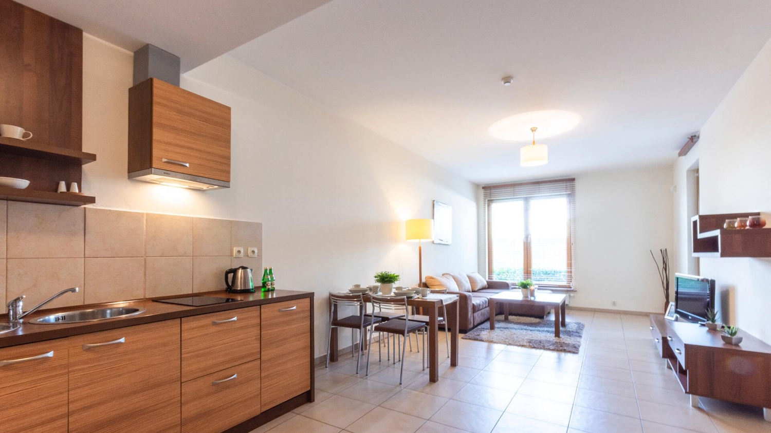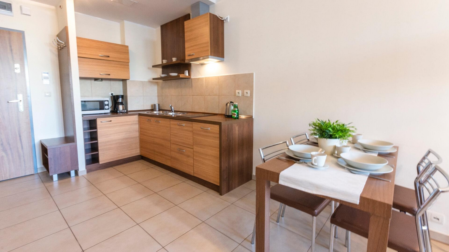W apartamencie znajduje się doskonale wyposażony aneks kuchenny przystosowany do zaspokajania codziennych potrzeb. Do dyspozycji Gości są sprzęty AGD m.in. lodówka, płyta indukcyjna z okapem, zmywarka, piekarnik oraz komplet naczyń, sztućce, akcesoria kuchenne, szklanki i kieliszki do wina. Wszystko, co potrzebne by samodzielnie przygotować posiłki i cieszyć się wspólnymi chwilami z bliskimi.