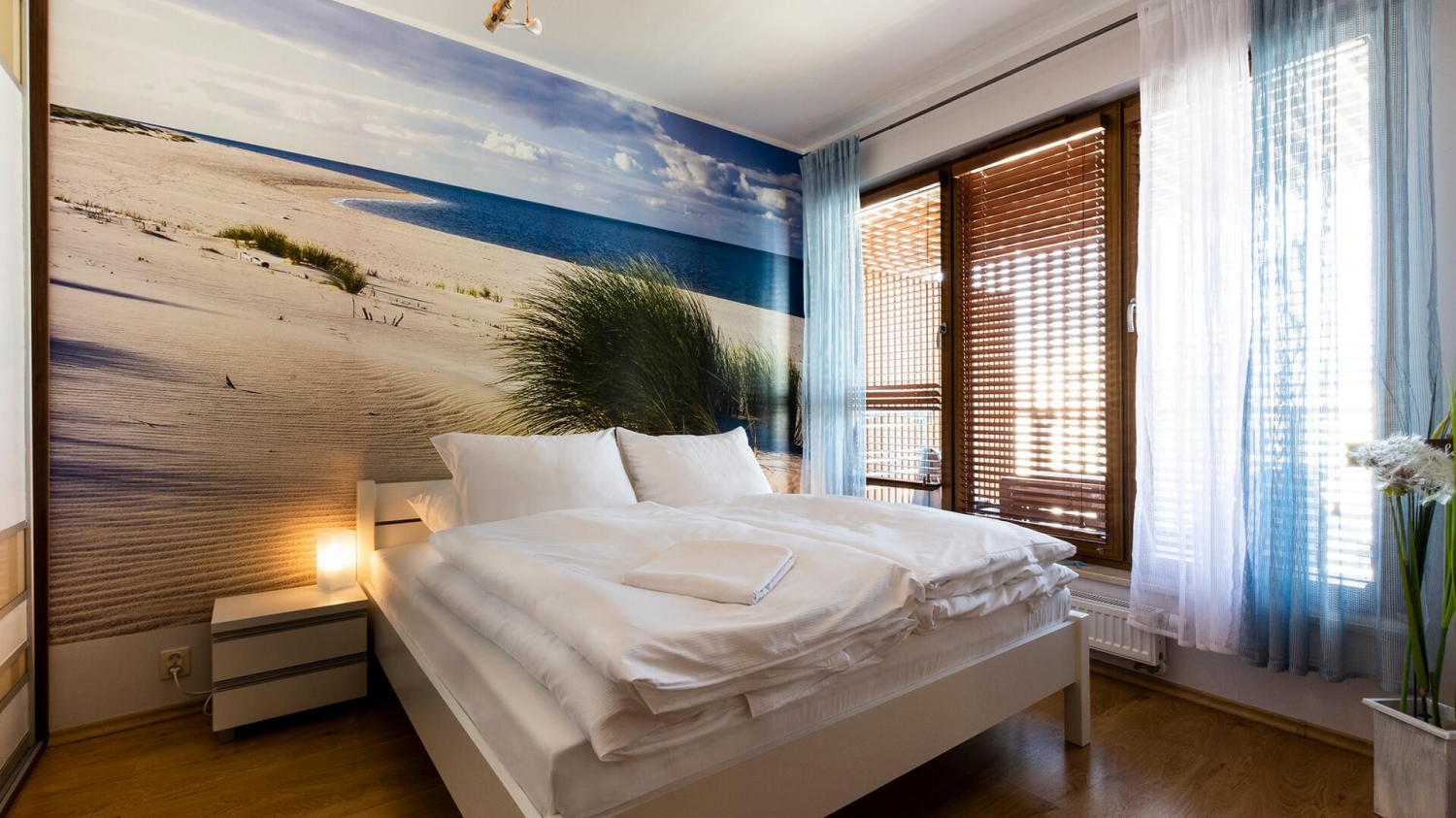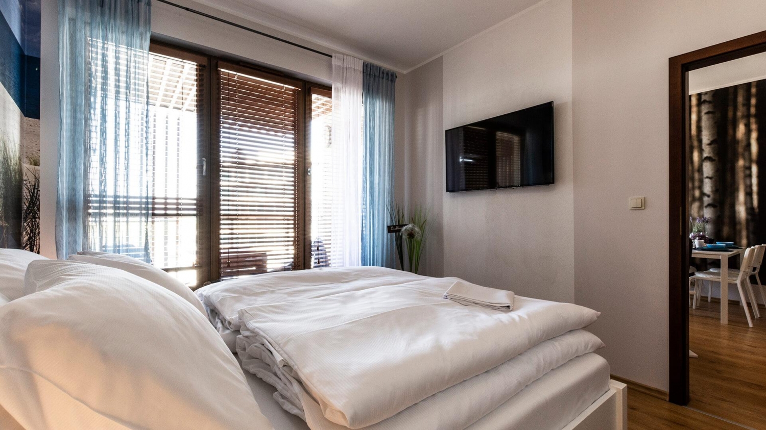 VacationClub™ Olympic Park Apartament B404 mieści się na 4. piętrze apartamentowca, posiada częściowy widok na morze, obiekt położony jest tuż przy promenadzie nadmorskiej w otoczeniu Ekoparku oraz zaledwie 60 m od morza. Lokal jest w pełni umeblowany i wyposażony. Apartament składa się z komfortowej sypialni z dużym łóżkiem małżeńskim, przestronnego salonu z rozkładaną sofą, łazienki z kabiną prysznicową oraz aneksu kuchennego. Do apartamentu przynależy balkon od strony północnej. Na miejscu do dyspozycji Gości jest telewizja w salonie i w sypialni, bezpłatny bezprzewodowy Internet oraz miejsce postojowe w garażu podziemnym.