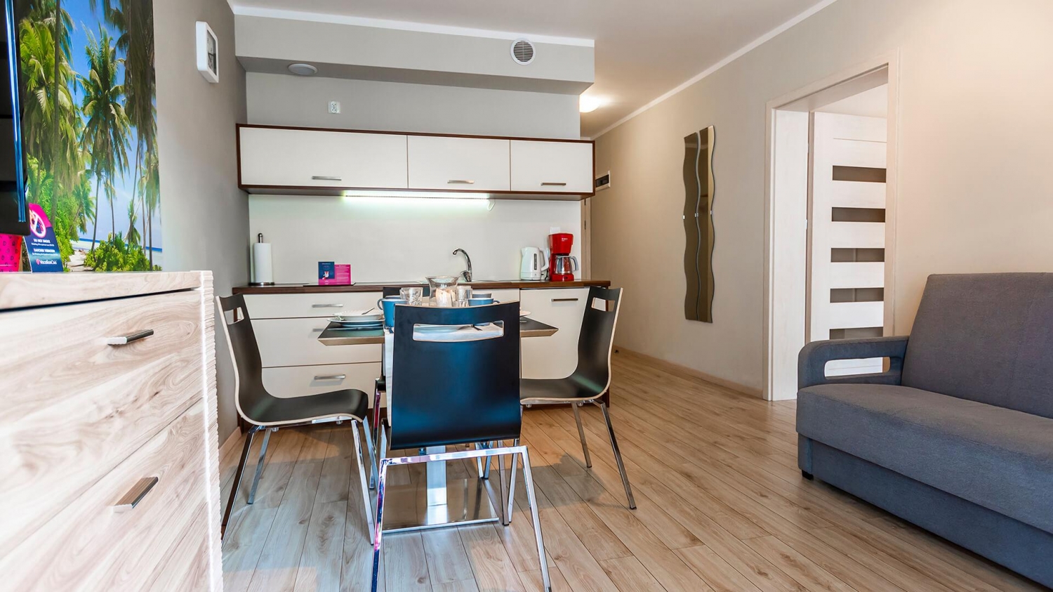 W apartamencie znajduje się w pełni wyposażony aneks kuchenny przystosowany do codziennych potrzeb Naszych Gości. Do dyspozycji oddajemy sprzęt AGD: lodówkę, płytę grzewczą, ekspres do kawy i opiekacz oraz komplet naczyń, sztućce, szklanki, filiżanki, kieliszki do wina oraz wszystkie inne akcesoria kuchenne niezbędne do samodzielnego przygotowania posiłków.
