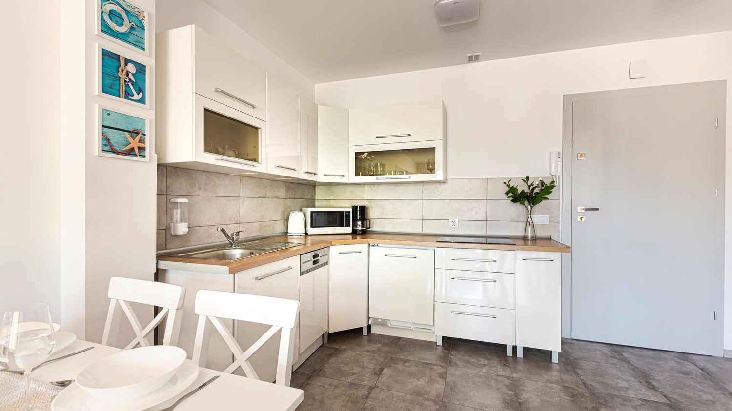 Aneks kuchenny został wyposażony w niezbędne sprzęty i akcesoria tak, aby zapewnić Gościom jak największy komfort i spełnić ich wszystkie potrzeby. Do dyspozycji udostępniamy sprzęt AGD m.in. lodówkę,zmywarkę, kuchenkę, kuchenkę mikrofalową, ekspres do kawy oraz komplet naczyń, sztućce, akcesoria kuchenne, szklanki i kieliszki do wina. Wszystko, co potrzebne by samodzielnie przygotować posiłki i cieszyć się wspólnymi chwilami z bliskimi.