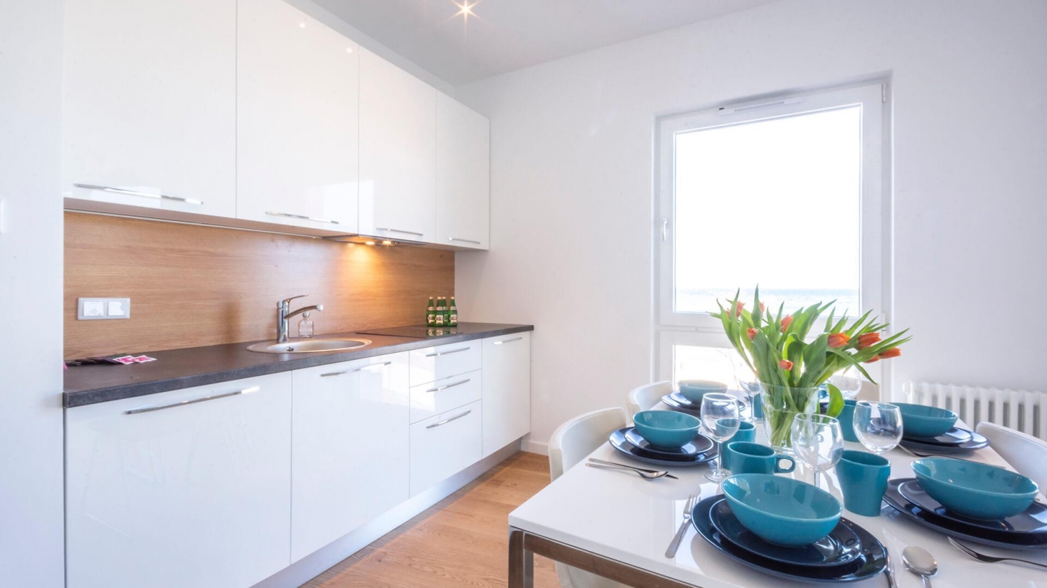 Do dyspozycji Gości jest nowoczesny aneks kuchenny z lodówką oraz kompletem naczyń i akcesoriami kuchennymi, szklanki i kieliszki do wina. Wszystko, co niezbędne aby samodzielnie przygotować posiłki i cieszyć się wspólnymi chwilami w gronie rodziny lub znajomych.