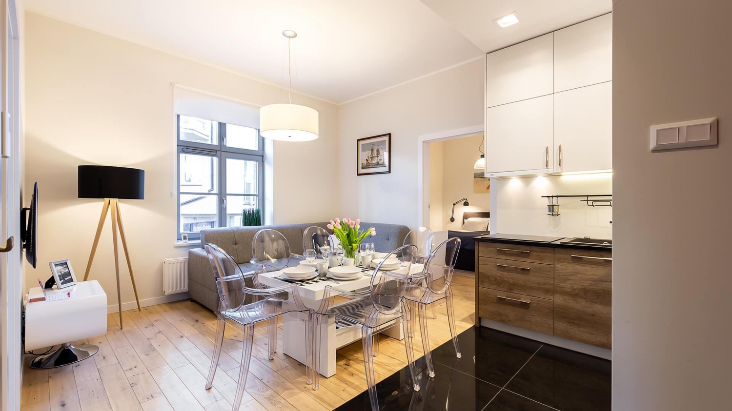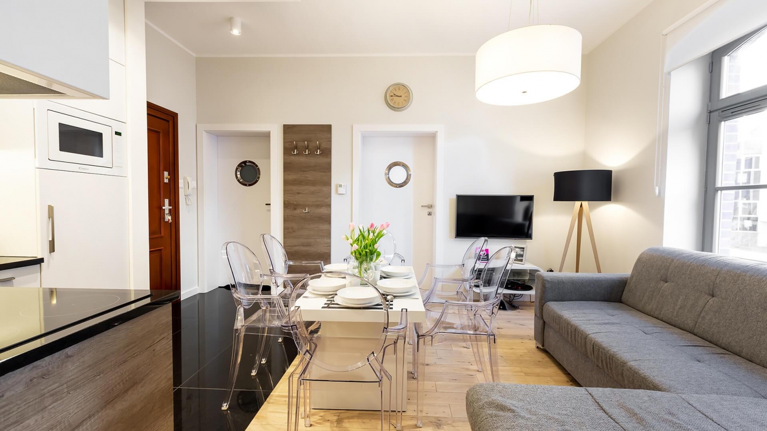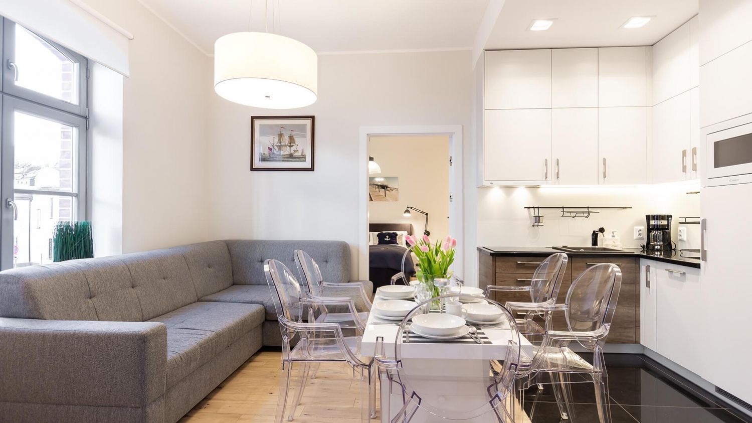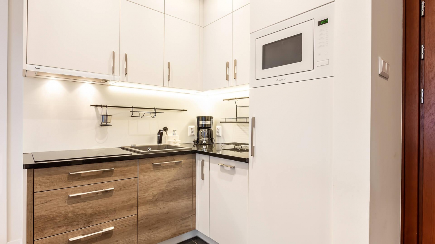 W apartamencie znajduje się aneks kuchenny przystosowany do przygotowywania codziennych posiłków. Do dyspozycji naszych Gości oddajemy lodówkę, kuchenkę, komplet naczyń – w tym kieliszki do wina, sztućce i akcesoria kuchenne. Wszystko, czego potrzebujesz, by przygotowywać posiłki i cieszyć się wspólnymi chwilami z bliskimi.