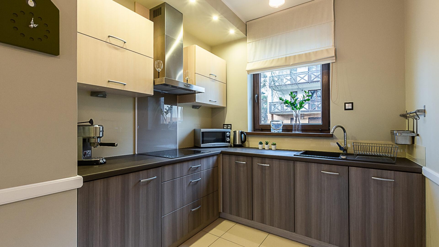 Do dyspozycji naszych Gości jest nowoczesny aneks kuchenny z lodówką, kuchenką mikrofalową, ekspresem do kawy i zmywarką, a także z kompletem naczyń, akcesoriami kuchennymi, szklankami i kieliszkami do wina. Znaleźć tu można wszystko, co niezbędne, by samodzielnie przygotowywać posiłki i cieszyć się wspólnymi chwilami w gronie rodziny lub znajomych.