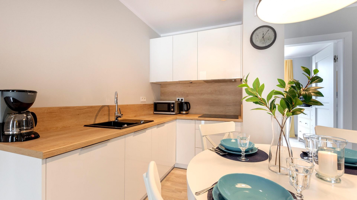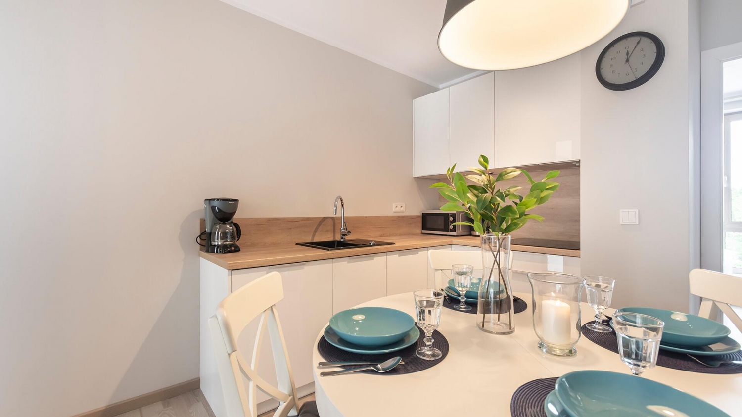 Do dyspozycji Gości jest nowoczesny aneks kuchenny z lodówką, zmywarką, kuchenką mikrofalową oraz kompletem naczyń i akcesoriami kuchennymi, szklanki i kieliszki do wina. Wszystko, co niezbędne aby samodzielnie przygotować posiłki i cieszyć się wspólnymi chwilami w gronie rodziny lub znajomych.
