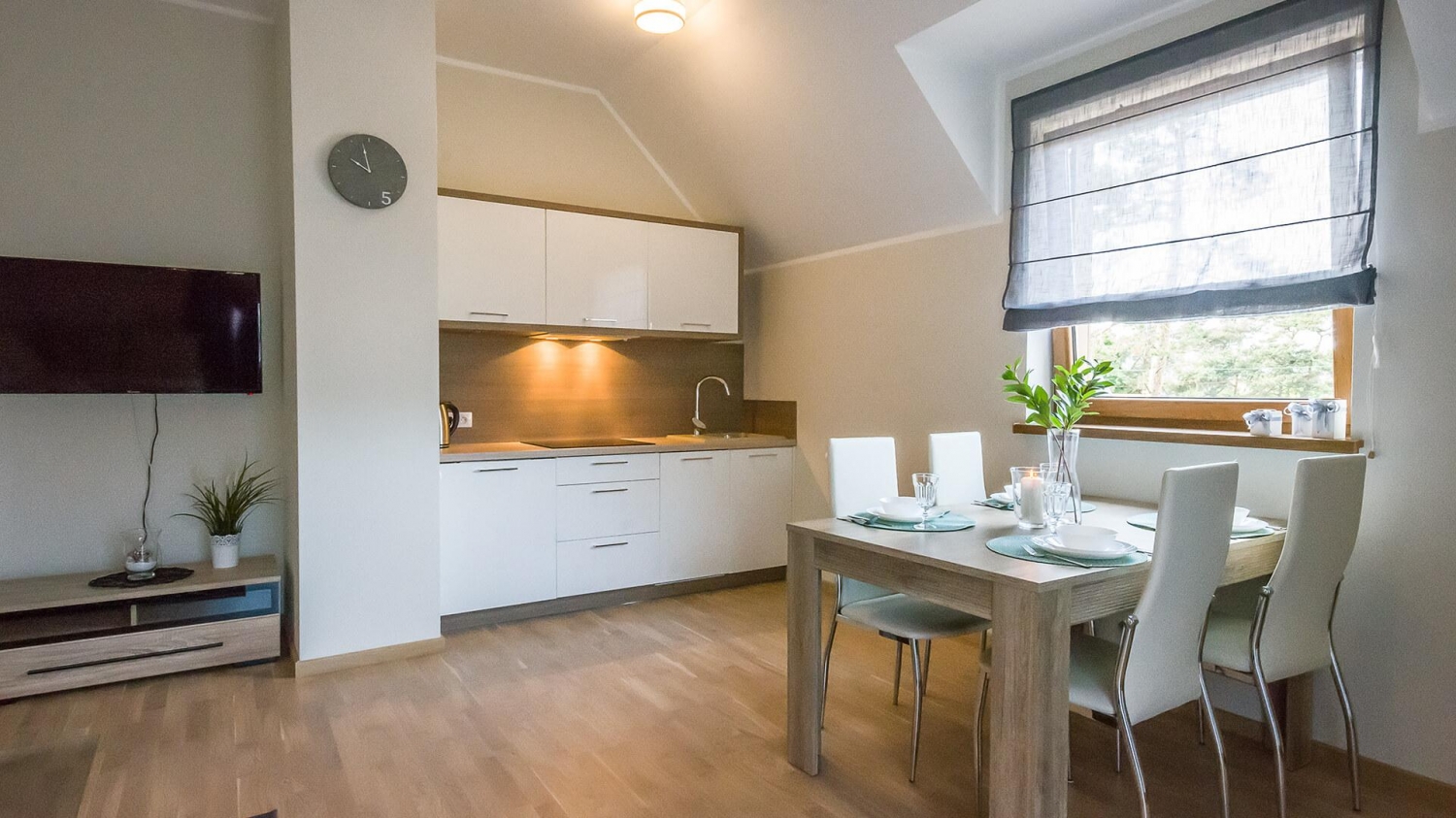 Do dyspozycji naszych Gości jest nowoczesny aneks kuchenny z lodówką, zmywarką oraz kompletem naczyń i akcesoriami kuchennymi, szklanki i kieliszki do wina. Wszystko, co niezbędne aby samodzielnie przygotować posiłki i cieszyć się wspólnymi chwilami w gronie rodziny lub znajomych.