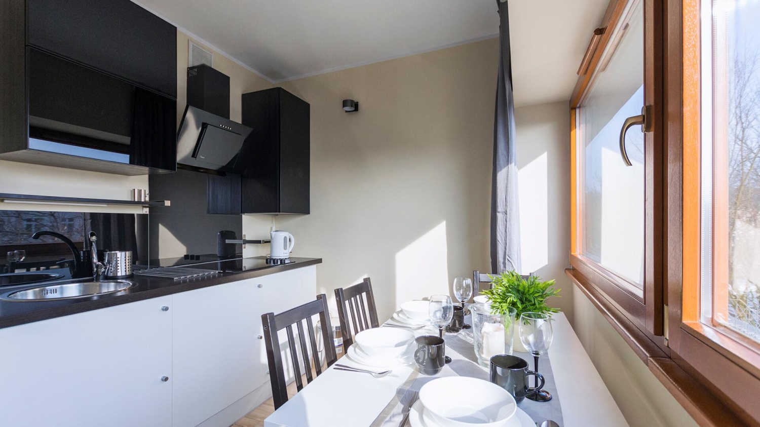 W apartamencie znajduje się aneks kuchenny przystosowany do zaspokajania codziennych potrzeb. Do dyspozycji naszych Gości udostępniamy lodówkę, płytę grzewczą, ekspres do kawy oraz komplet naczyń, sztućce, akcesoria kuchenne, szklanki i kieliszki do wina. Wszystko, co potrzebne by samodzielnie przygotować posiłki i cieszyć się wspólnymi chwilami z bliskimi.