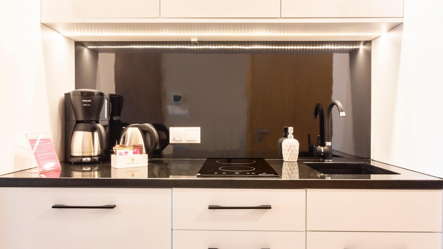 W apartamencie znajduje się aneks kuchenny przystosowany do przygotowywania codziennych posiłków. Do dyspozycji Gości jest sprzęt AGD, m.in. lodówka, płyta indukcyjna, czajnik elektryczny oraz ekspres do kawy, a także komplet naczyń, sztućce, akcesoria kuchenne, szklanki i kieliszki do wina. Znaleźć tu można wszystko, co niezbędne, by samodzielnie przygotowywać posiłki i cieszyć się wspólnymi chwilami w gronie rodziny lub znajomych.
