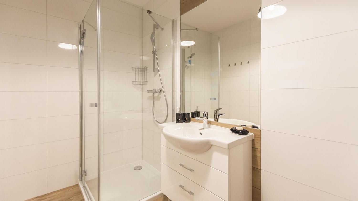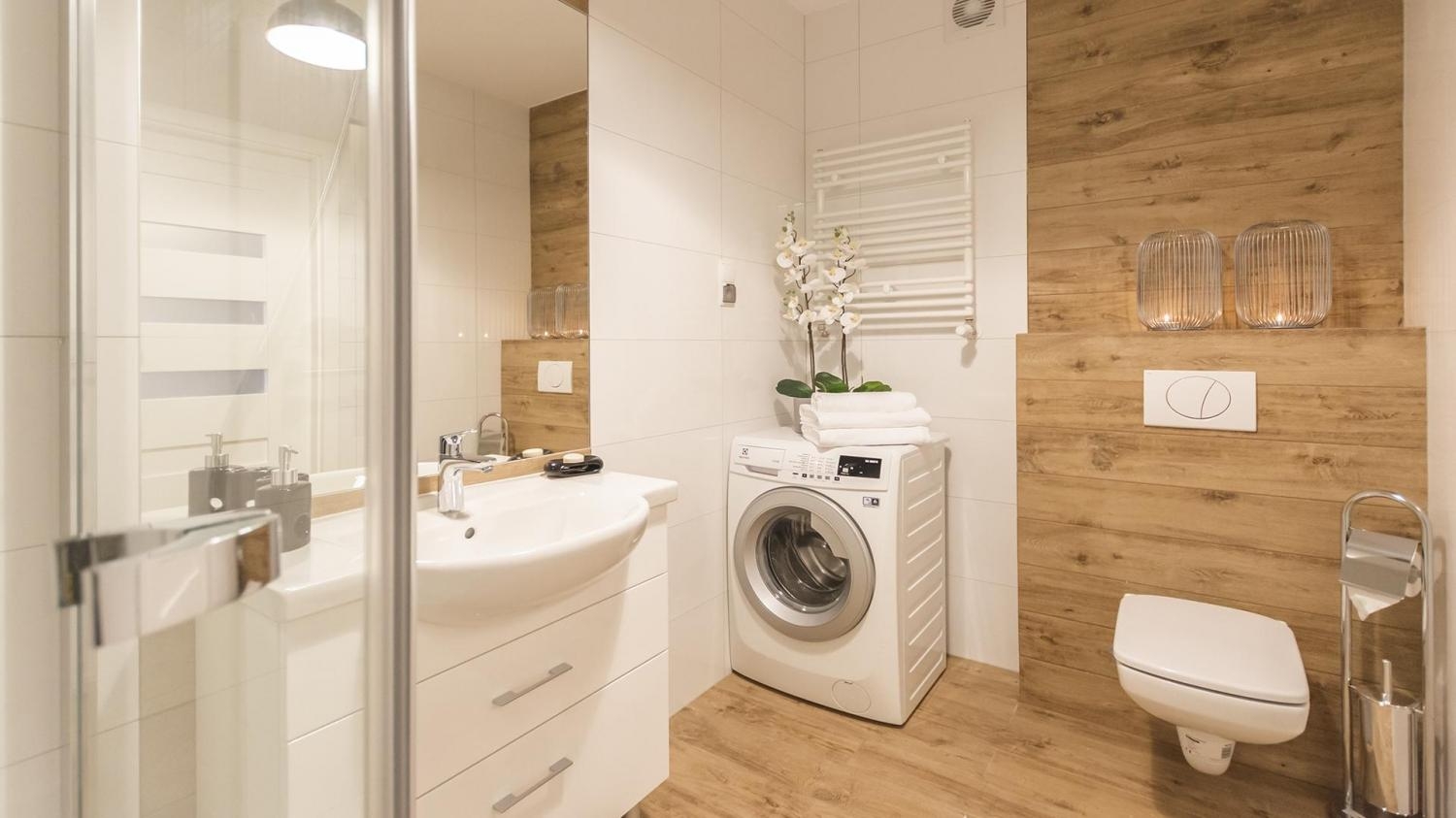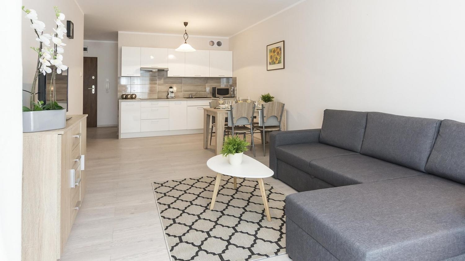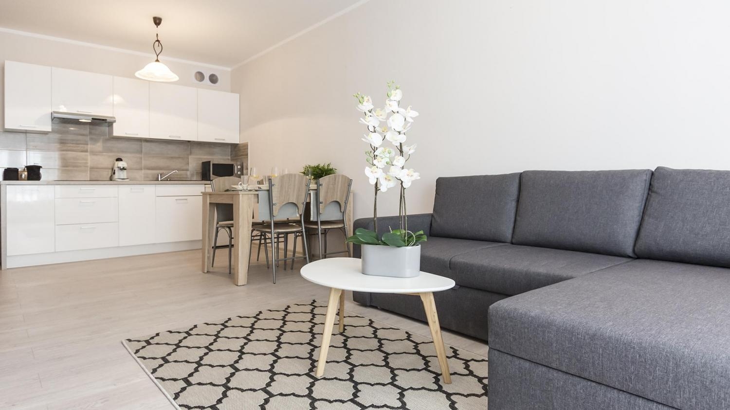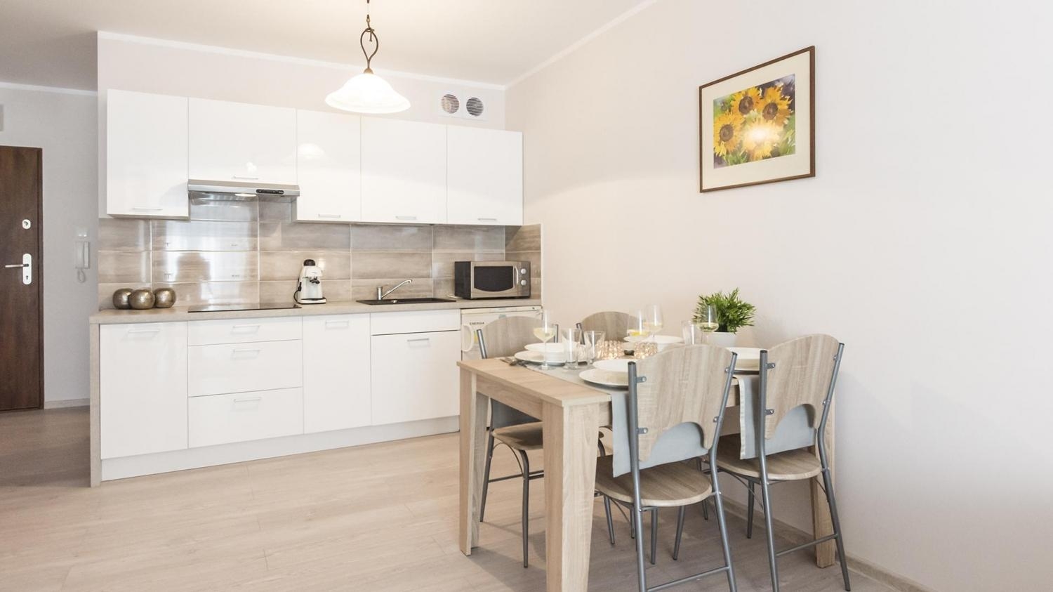 W apartamencie znajduje się także doskonale wyposażony aneks kuchenny. Do dyspozycji naszych Gości udostępniamy sprzęt AGD m.in. lodówkę, kuchenkę oraz komplet naczyń, sztućce, akcesoria kuchenne, szklanki i kieliszki do wina. Wszystko, co potrzebne by samodzielnie przygotować posiłki i cieszyć się wspólnymi chwilami z bliskimi.