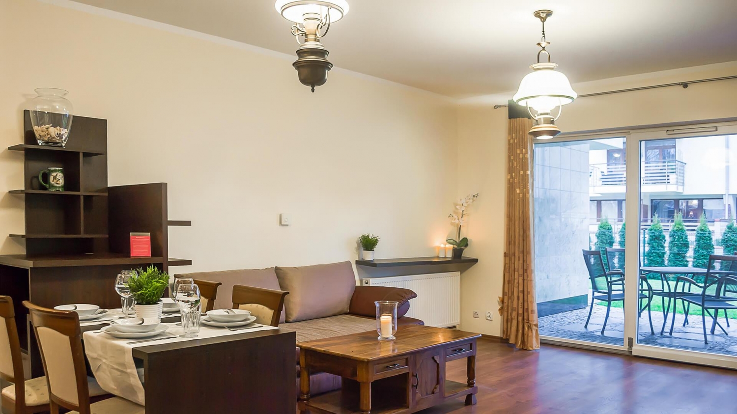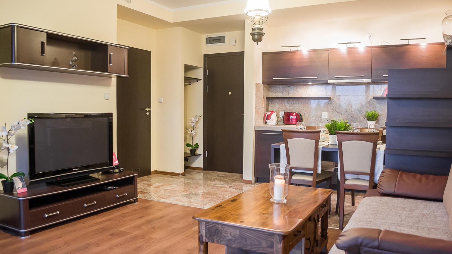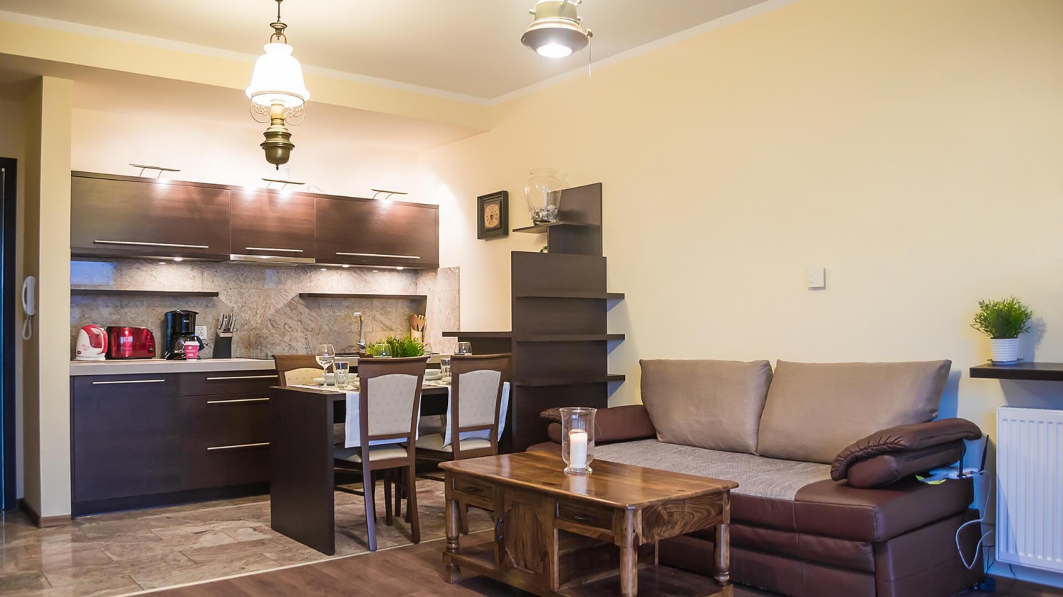 W apartamencie znajduje się bogato wyposażony aneks kuchenny, przystosowany do zaspokajania codziennych potrzeb. Do dyspozycji naszych Gości udostępniamy nowoczesny sprzęt AGD m.in. lodówkę, kuchenkę, a także komplet naczyń, sztućce, akcesoria kuchenne, szklanki i kieliszki do wina, dzięki którym przygotujesz ulubione posiłki dla siebie i najbliższych.