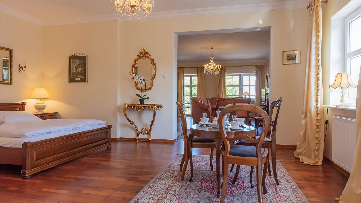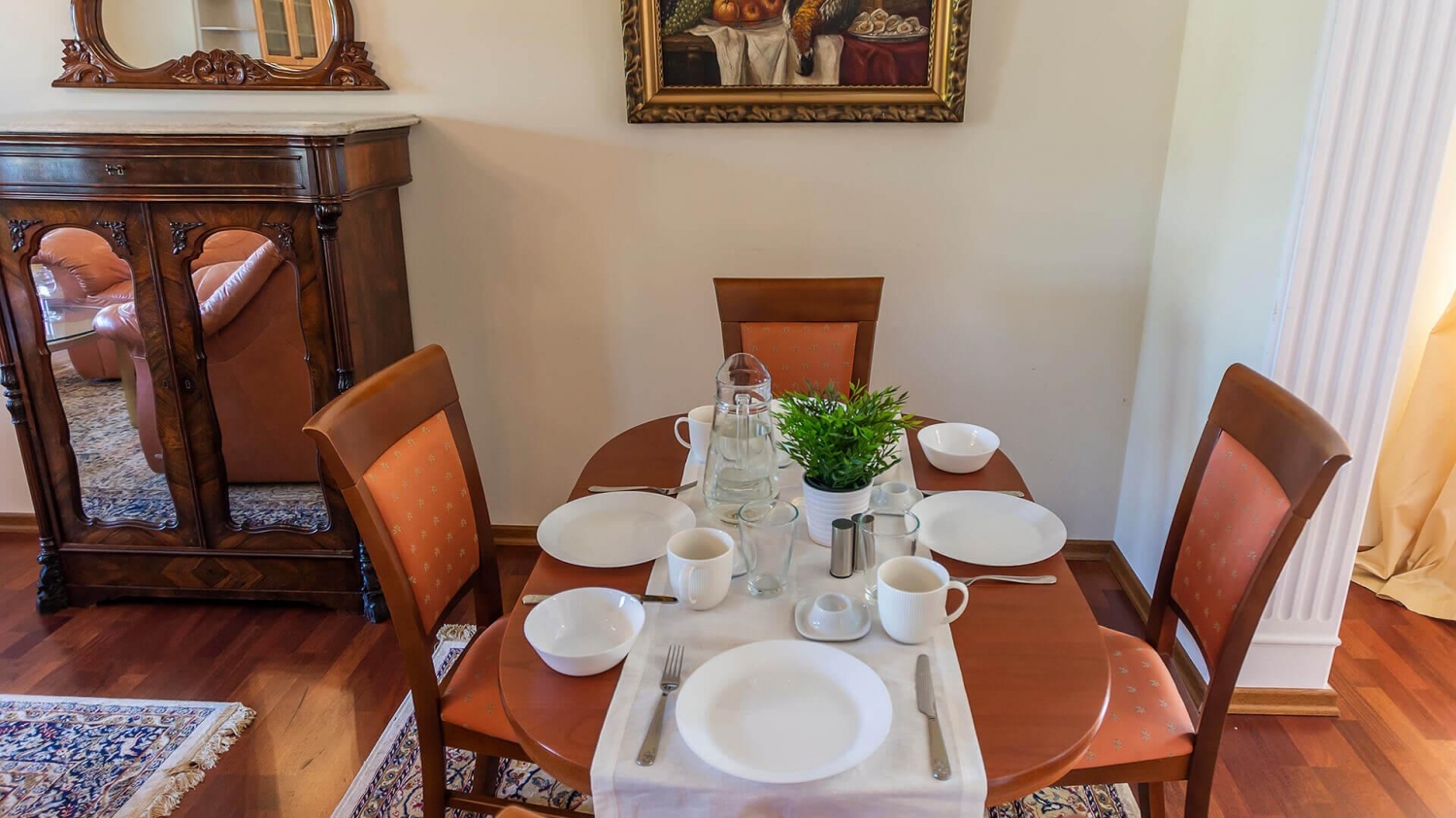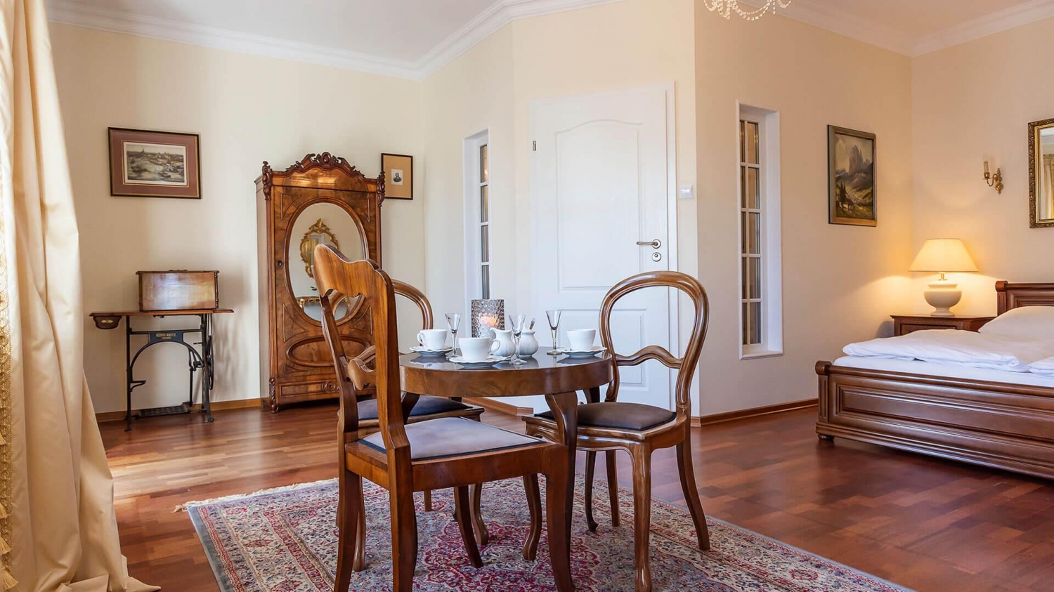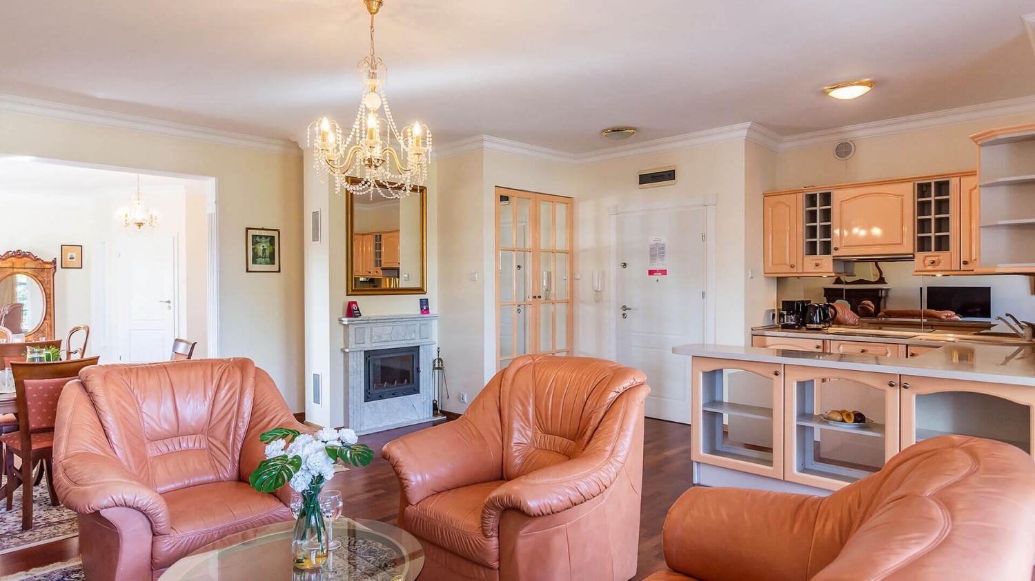 Przestronny salon posiada duży oddzielony barkiem aneks kuchenny gotowy na wspólne przygotowywanie posiłków w eleganckim królewskim otoczeniu. Do dyspozycji Gości znajduje się płyta grzewcza, pralka i zmywarka, opiekacz, ekspres do kawy oraz wszelkie niezbędne przybory kuchenne.