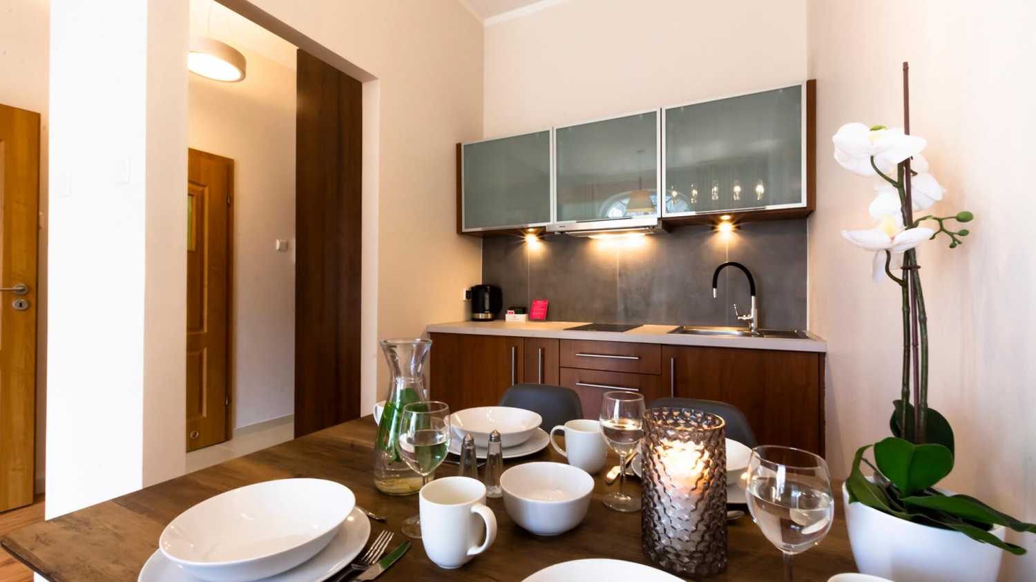 W apartamencie znajduje się bogato wyposażony aneks kuchenny, przystosowany do zaspokajania codziennych potrzeb. Do dyspozycji naszych Gości udostępniamy nowoczesny sprzęt AGD m.in. lodówkę, kuchenkę, a także komplet naczyń, sztućce, akcesoria kuchenne, szklanki i kieliszki do wina - wszystko, co potrzebne, by samodzielnie przygotować posiłki i cieszyć się wspólnymi chwilami z bliskimi.